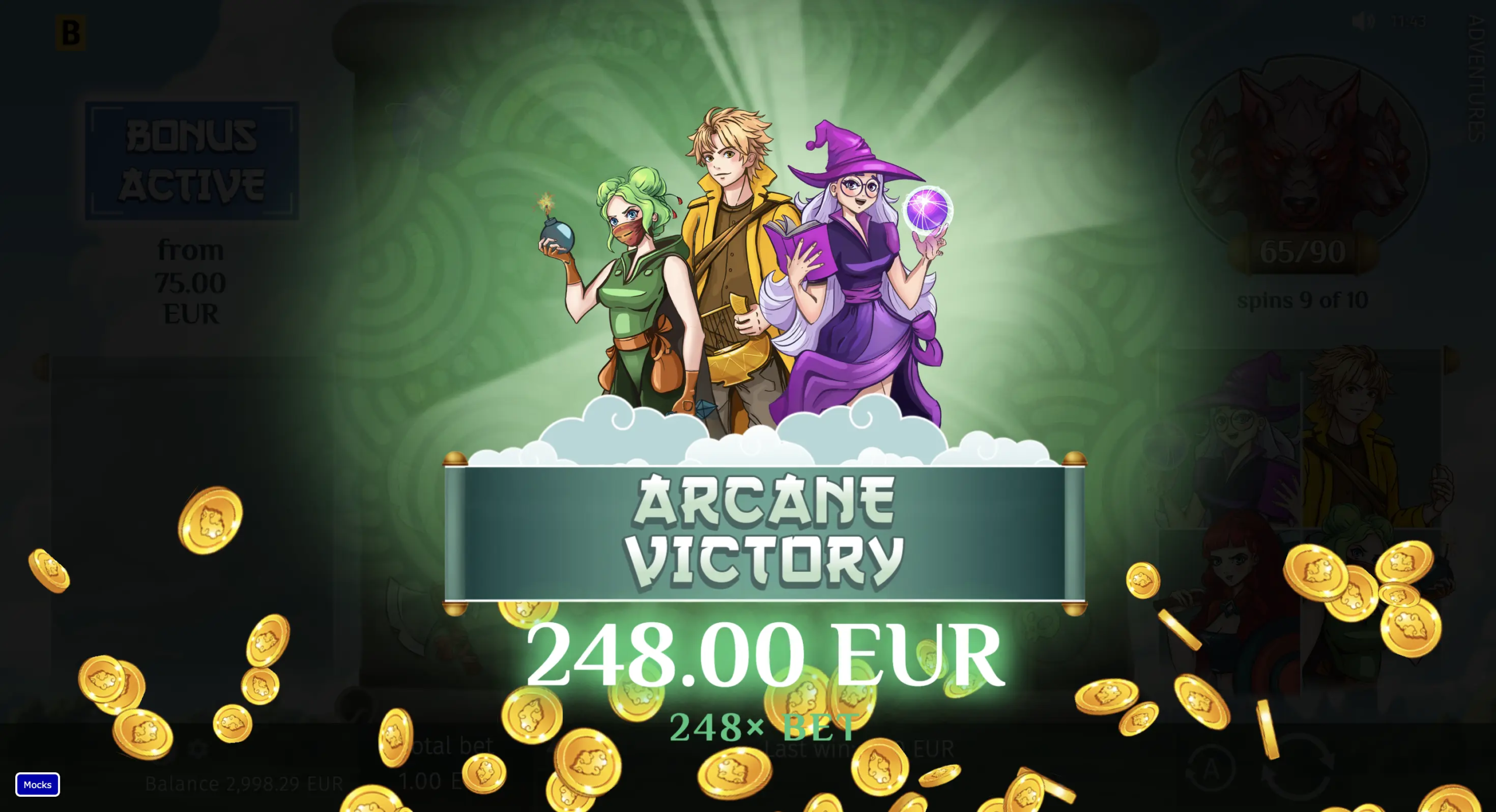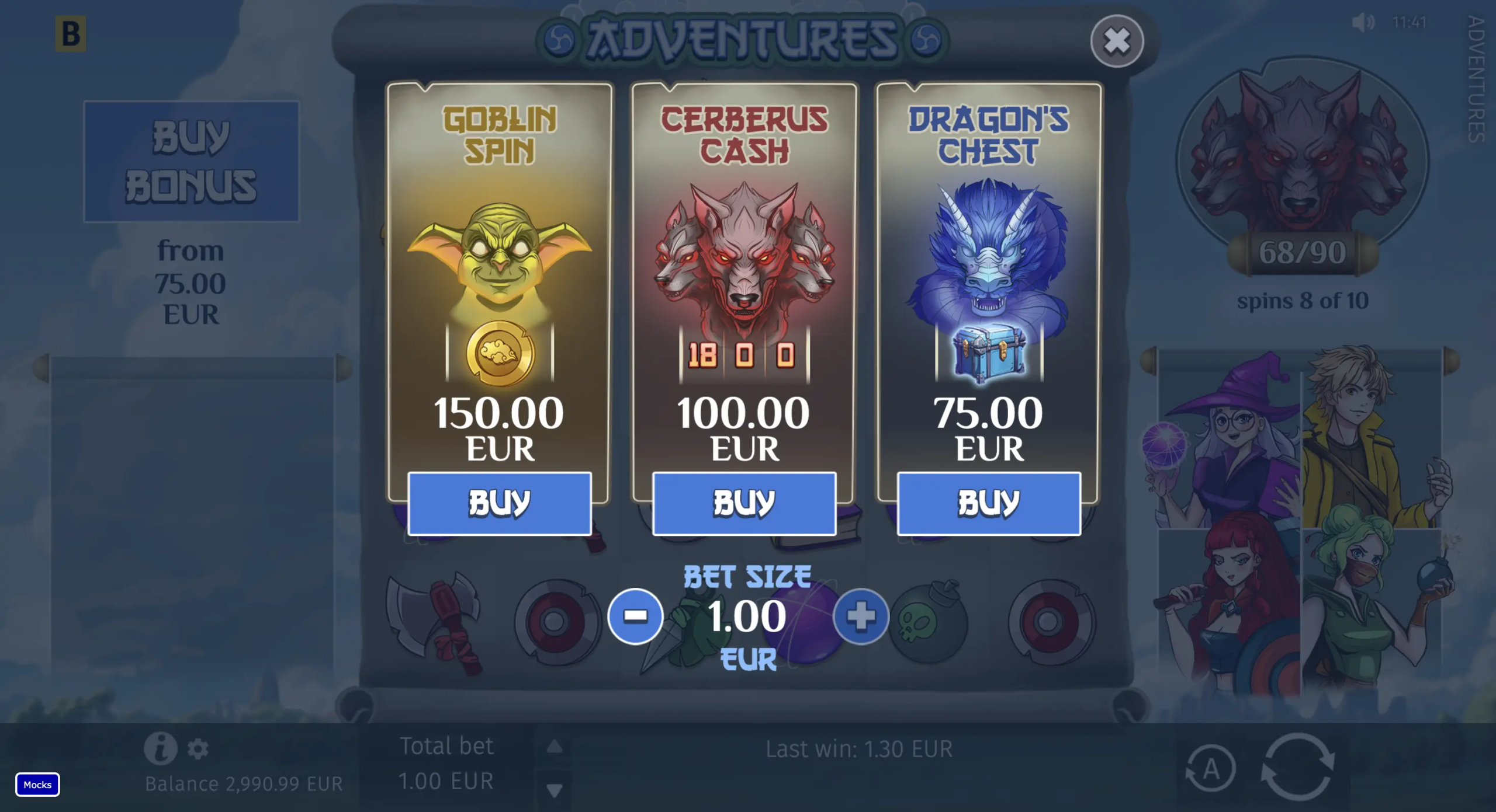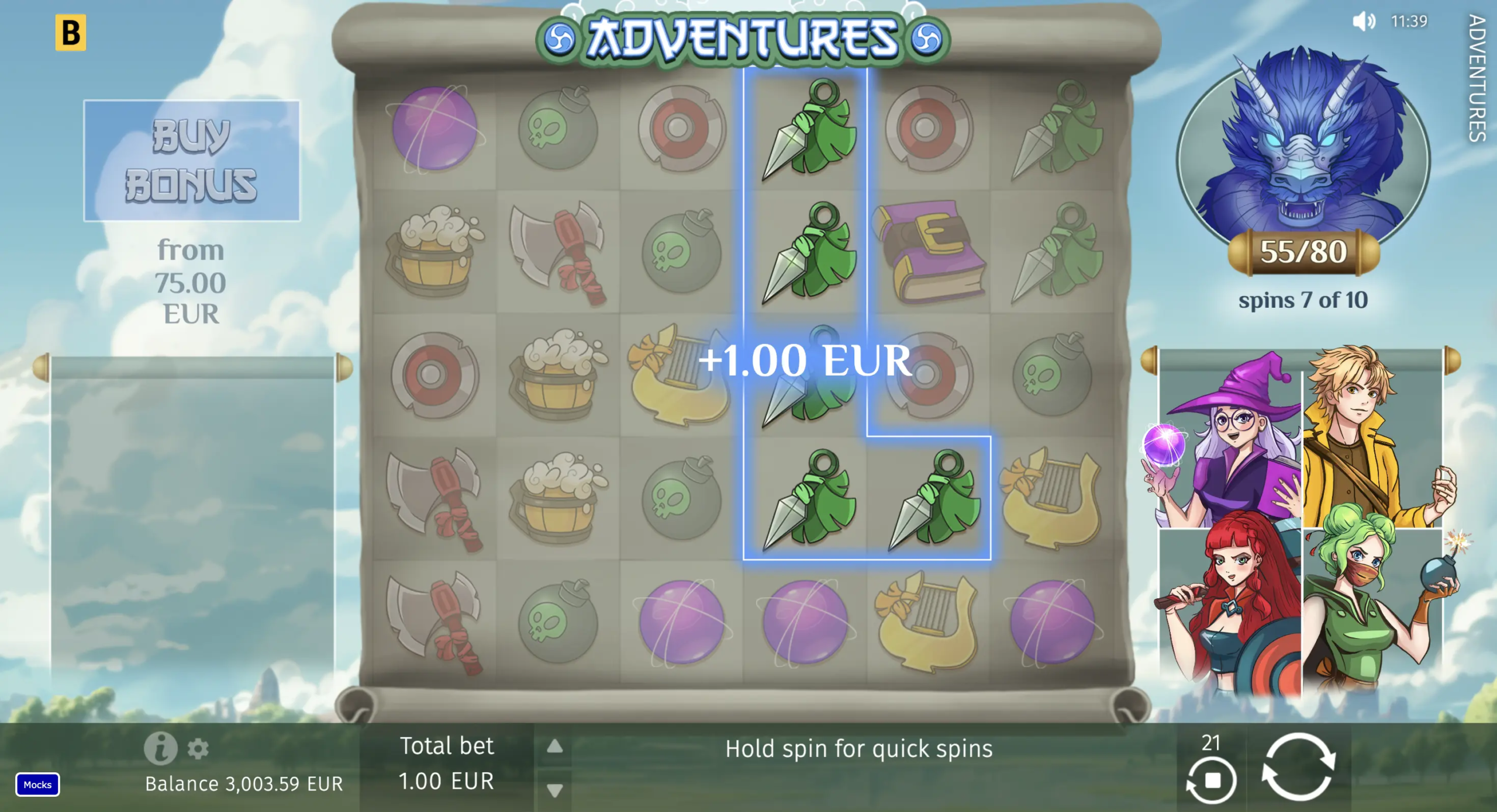 Esta tragamonedas RPG de anime muestra la mecánica de Bonanza con un sistema de ciclos. Cada 10 giros, las combinaciones ganadoras reducen los puntos de vida de un monstruo. Cuando baje a cero, se activa una de las 3 partidas de bonificación. Al usar Buy Bonus, los juegos se inician inmediatamente.