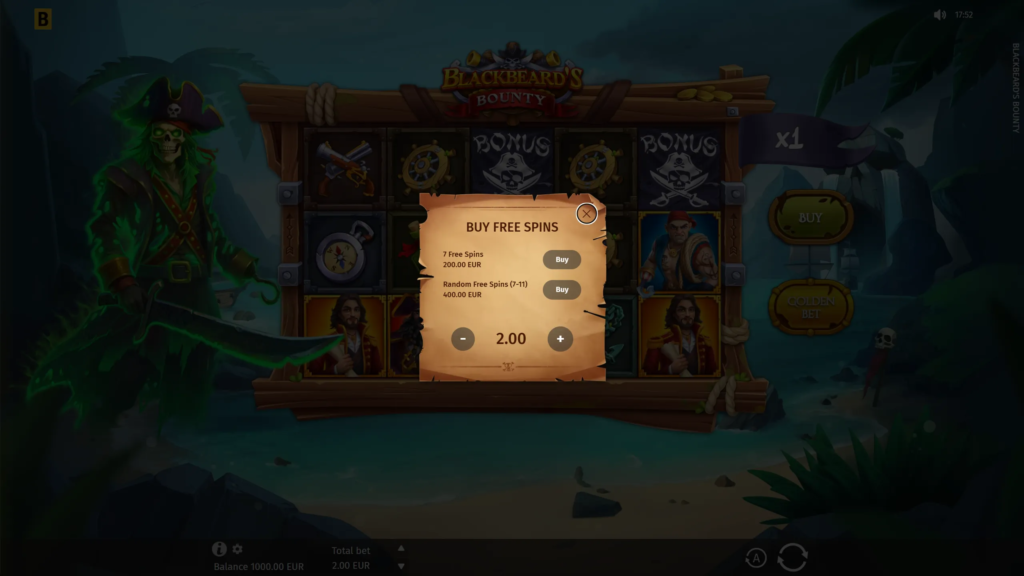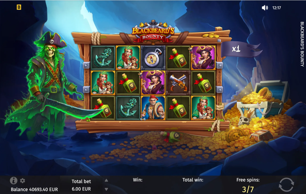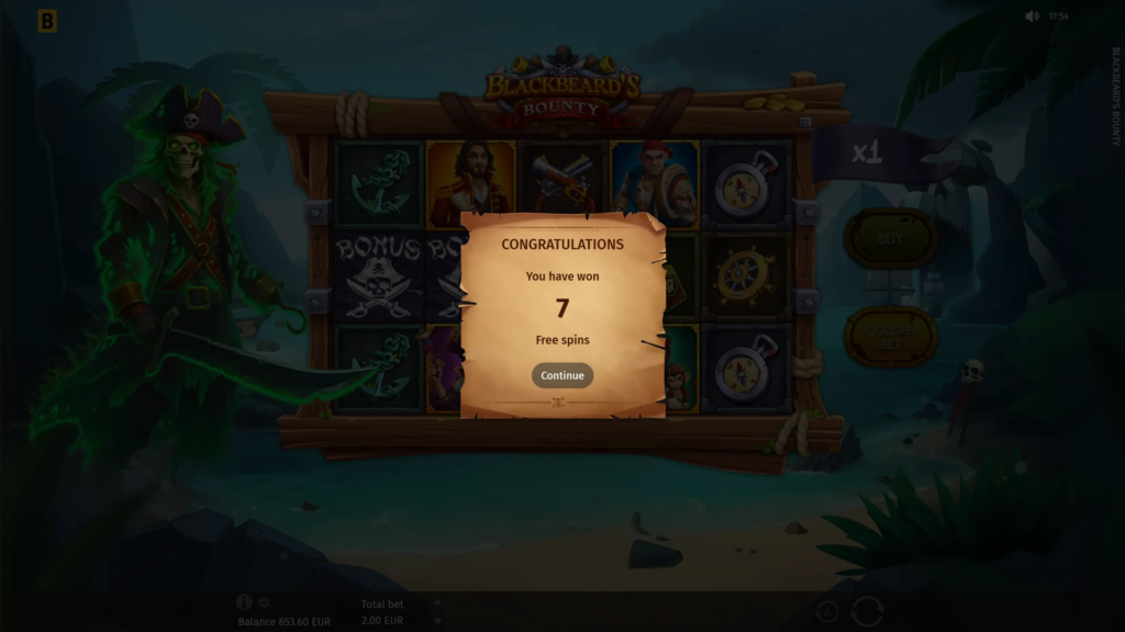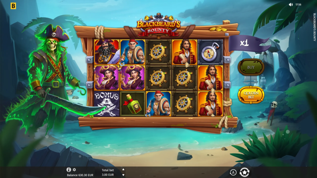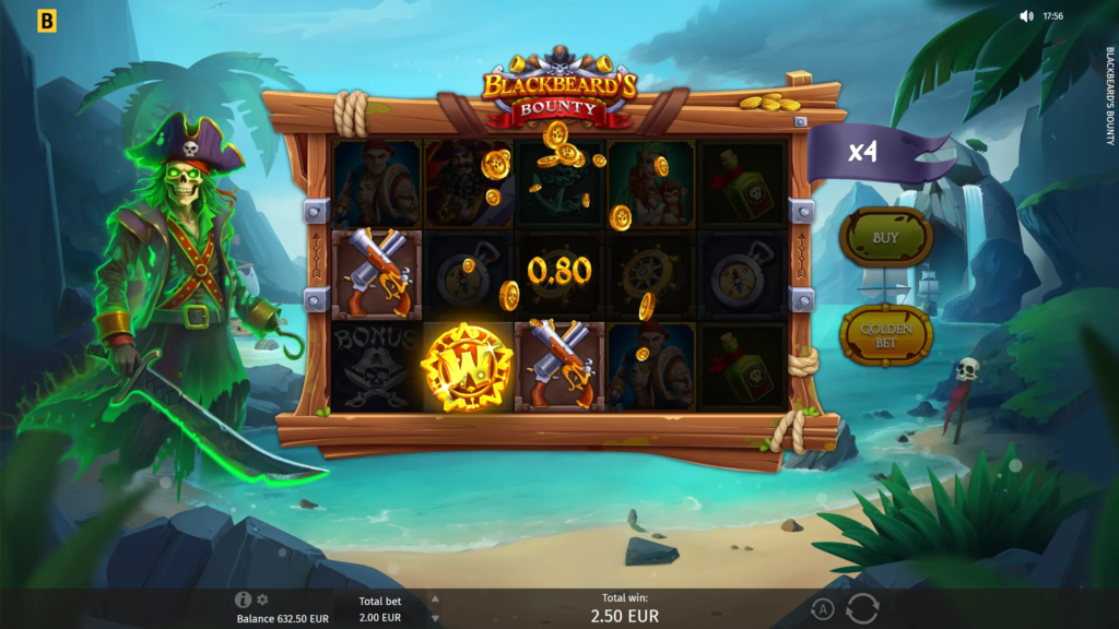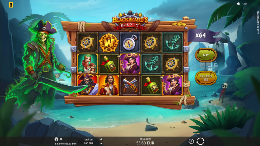 The 5×3 grid may look simple, but this is no ordinary slot, matey! Each winning combo sets off a cascading chain reaction, with a Wild symbol at the end of each, boosting your multiplier with every win. In the Bonus round, that multiplier keeps growing until free spins end. Want even more Free Spins? Activate Golden Bet for a better shot at treasure, or use Buy Bonus for a direct route to Blackbeard’s bounty!