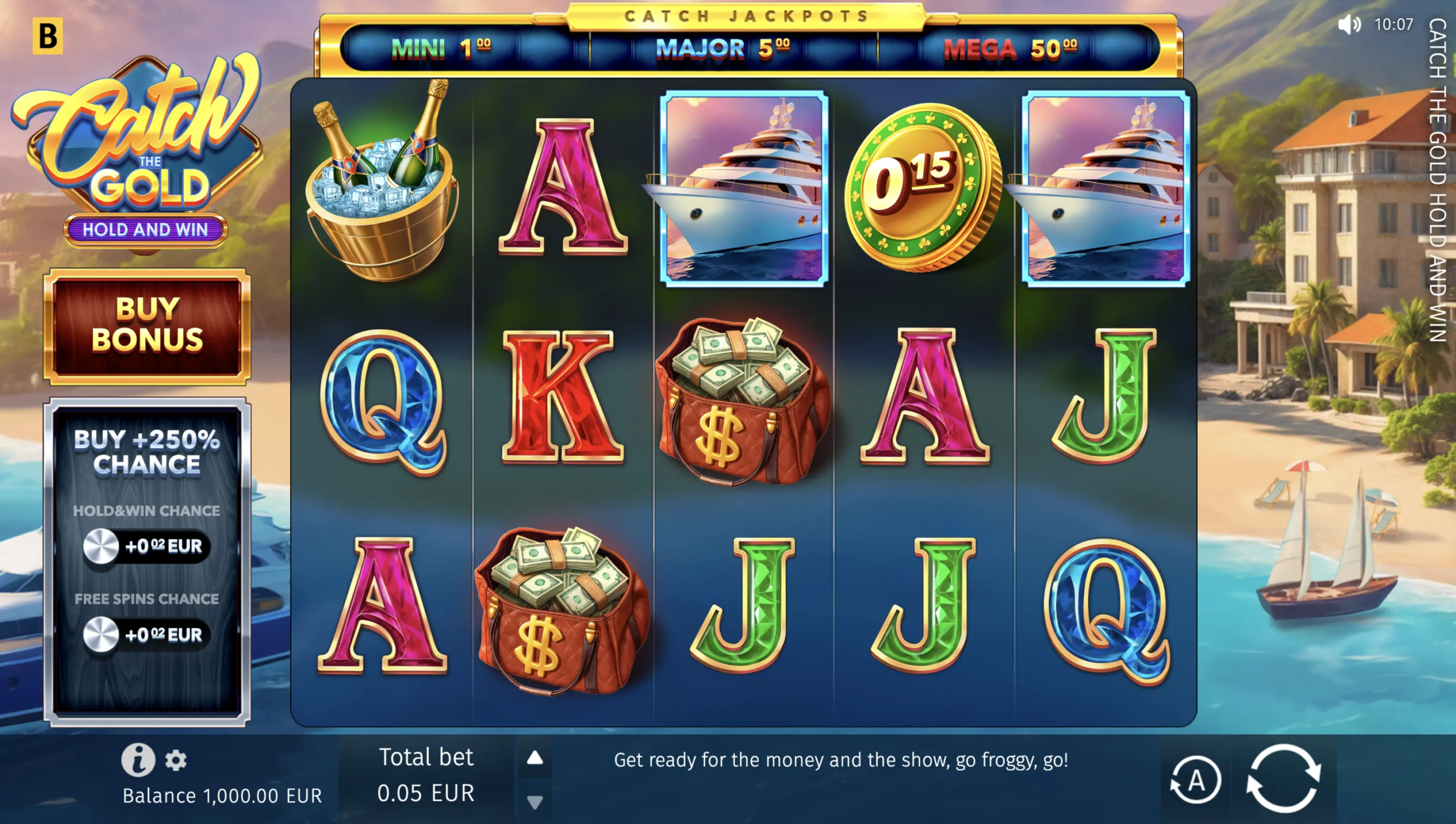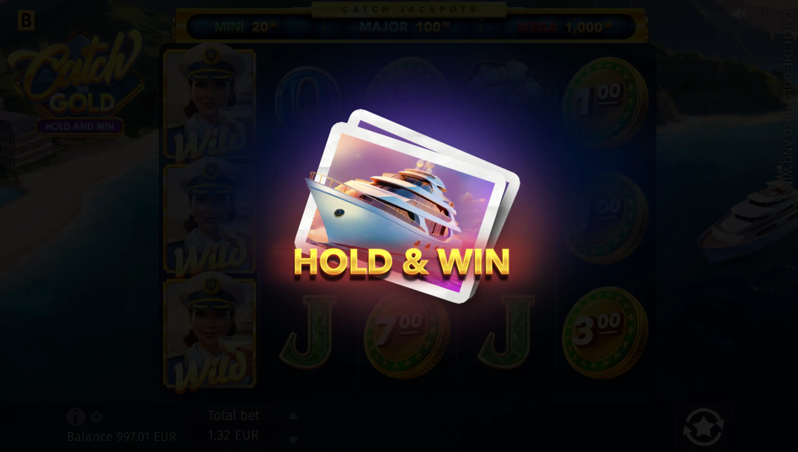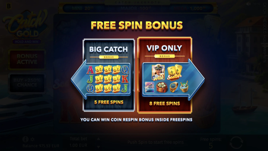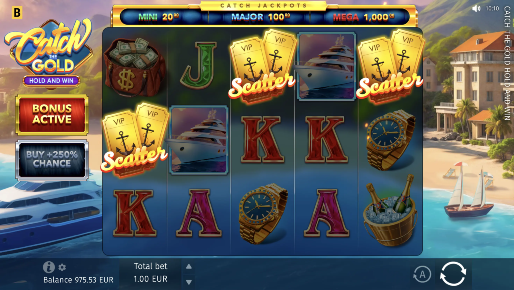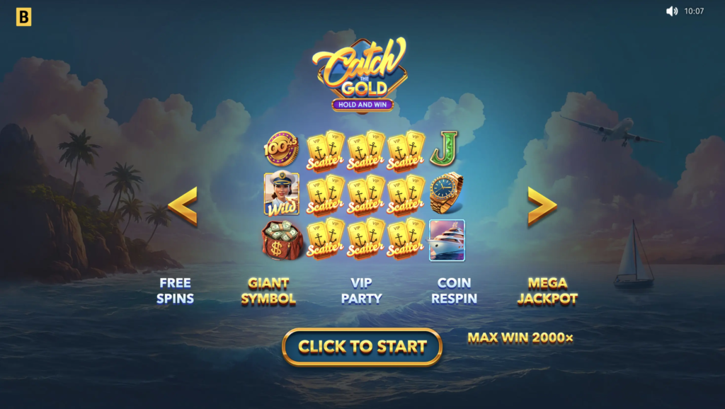 ¡Atención, todos los asistentes al crucero! Ten en cuenta que tu paquete exclusivo incluye una lujosa ceremonia de Hold & Win con 3 jackpots suficientes y 2 eventos excepcionales de tiradas gratis. Durante Big Catch, los cilindros 2 a 4 se llenan con el mismo símbolo durante 5 tiradas; mientras tanto, el grupo VIP Only solo sirve símbolos altos o medios durante 8 tiradas. Estamos a punto de partir, ¡así que coge el champán y prepárate para conseguir grandes premios!