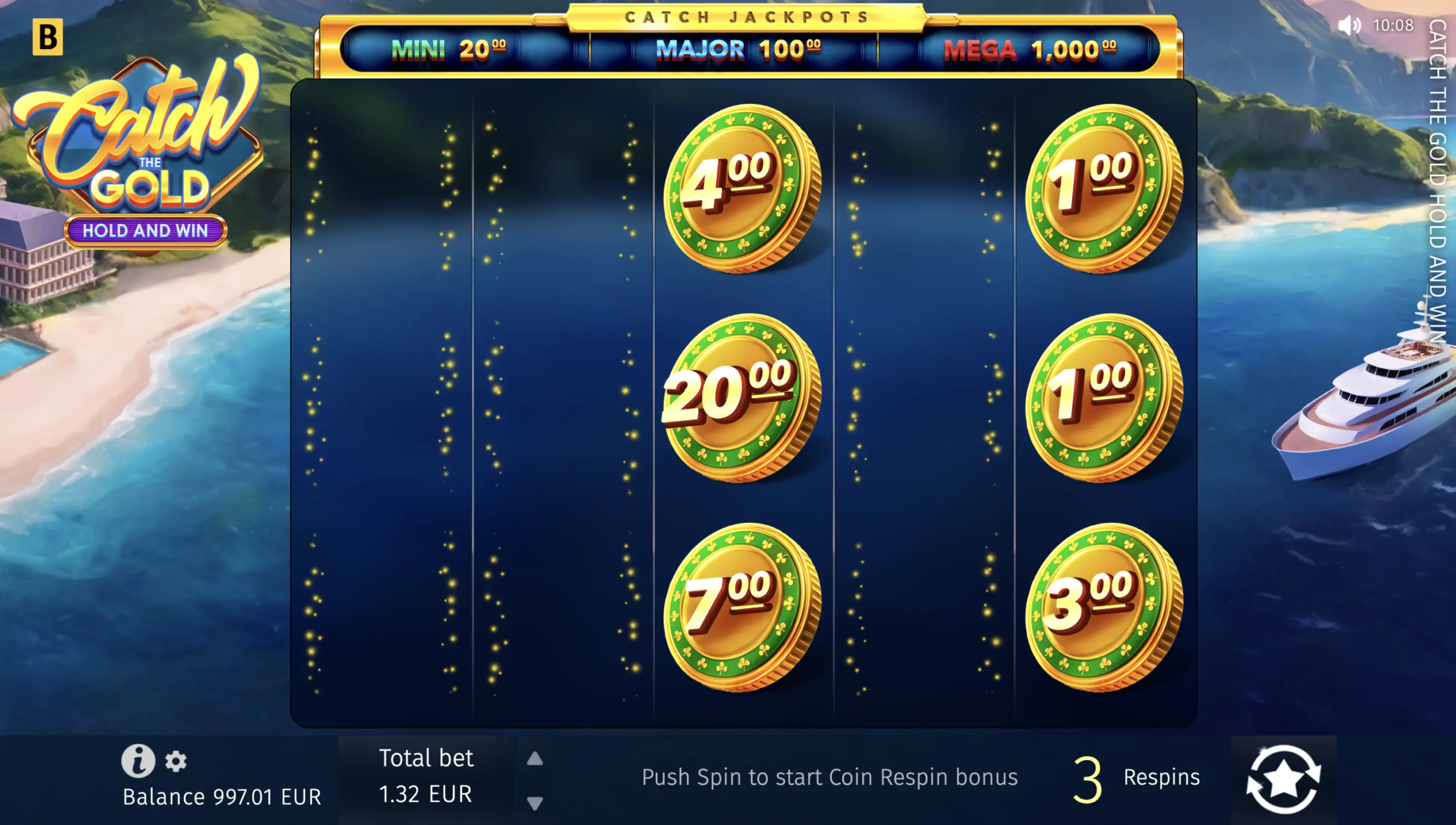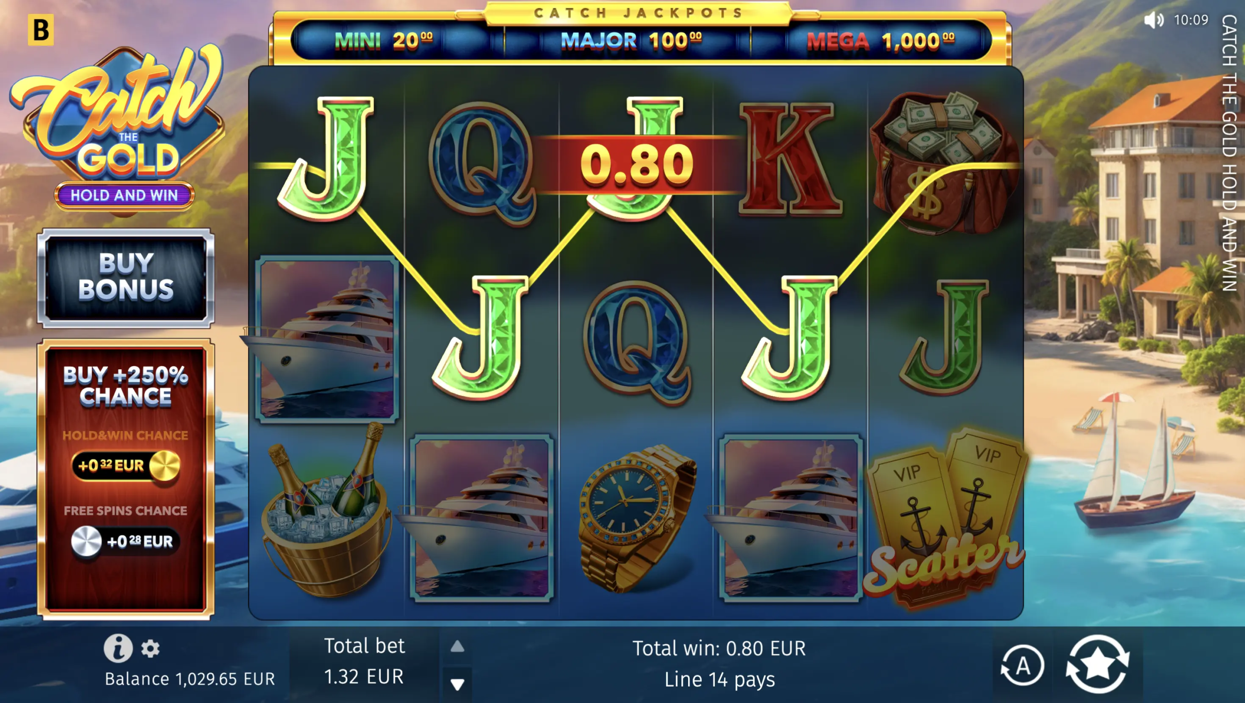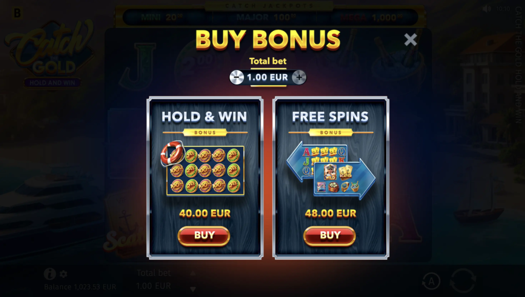 ¡Atención, todos los asistentes al crucero! Ten en cuenta que tu paquete exclusivo incluye una lujosa ceremonia de Hold & Win con 3 jackpots suficientes y 2 eventos excepcionales de tiradas gratis. Durante Big Catch, los cilindros 2 a 4 se llenan con el mismo símbolo durante 5 tiradas; mientras tanto, el grupo VIP Only solo sirve símbolos altos o medios durante 8 tiradas. Estamos a punto de partir, ¡así que coge el champán y prepárate para conseguir grandes premios!