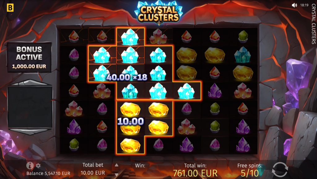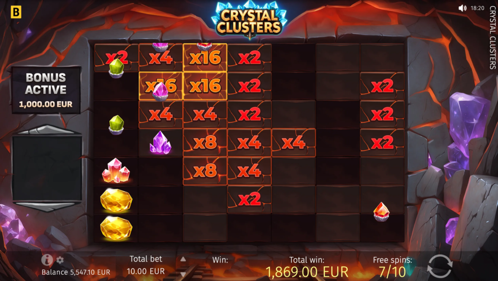 Cuando los cristales chocan, la suerte se enciende. En Crystal Clusters, las gemas brillantes se unen en una cuadrícula rectangular, creando multiplicadores que aumentan con cada explosión. Las tiradas gratis bloquean tus multiplicadores, haciendo que cada cascada brille con más intensidad y que cada tirada sea una delicia reluciente. Sumérgete y descubre las gemas que se esconden en las profundidades.