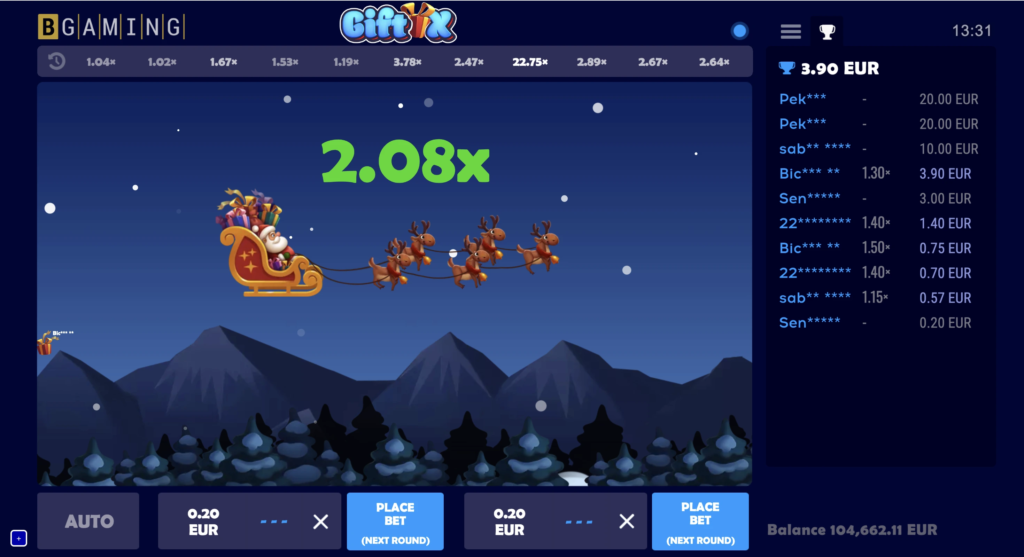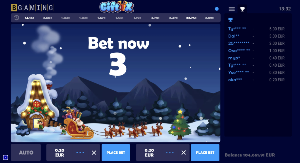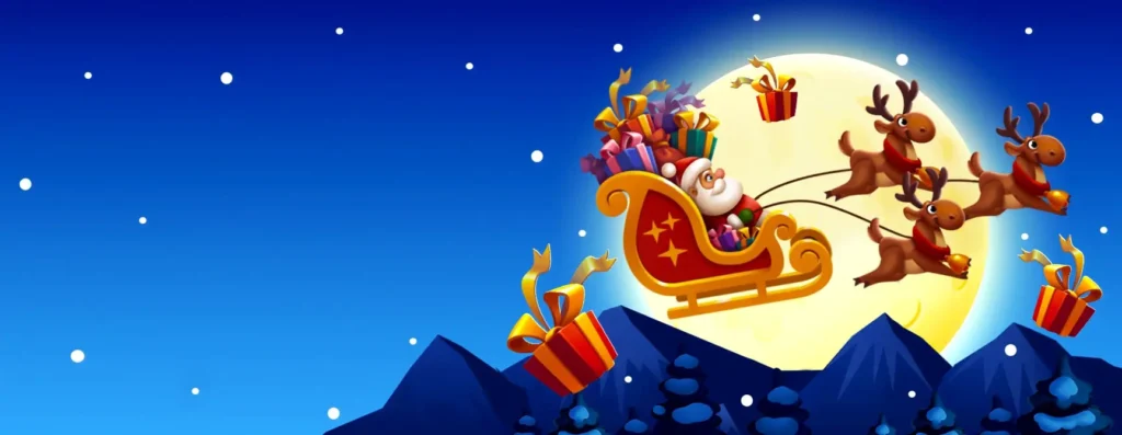 Este juego de choque repleto de Navidad presenta a Papá Noel volando por los cielos y dejando caer regalos. Los jugadores hacen una o dos apuestas a la vez, ven cómo Papá Noel monta y recogen los regalos cuando quieren antes de que Papá Noel se vaya.