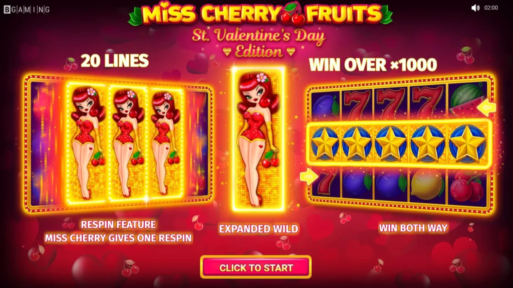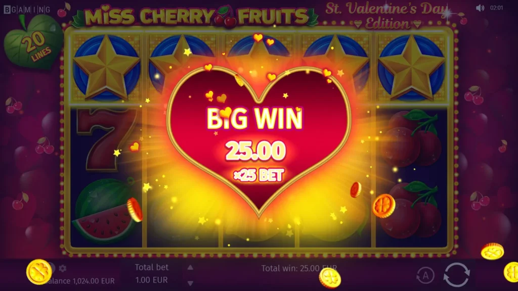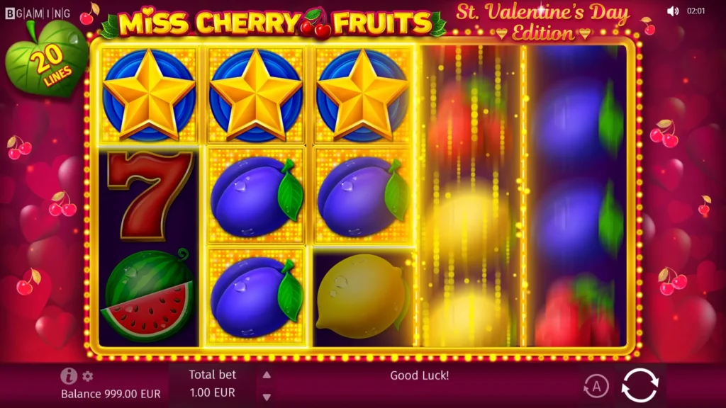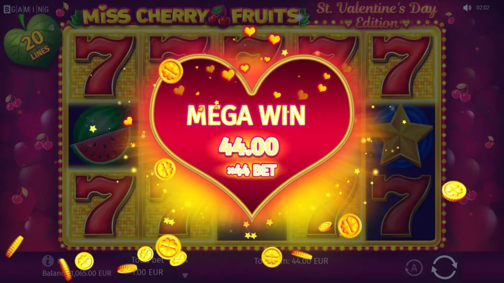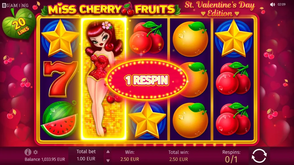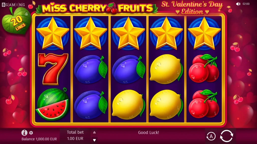 ¡Celebra el día del amor con el reskin de San Valentín de Miss Cherry Fruits! Esta generosa tragaperras ofrece fantásticos premios y cuenta con un RTP del 96,13%. ¡Prueba suerte, multiplica tu apuesta hasta x1000 y deja que Miss Cherry Fruits haga que tu día de San Valentín sea mágico!