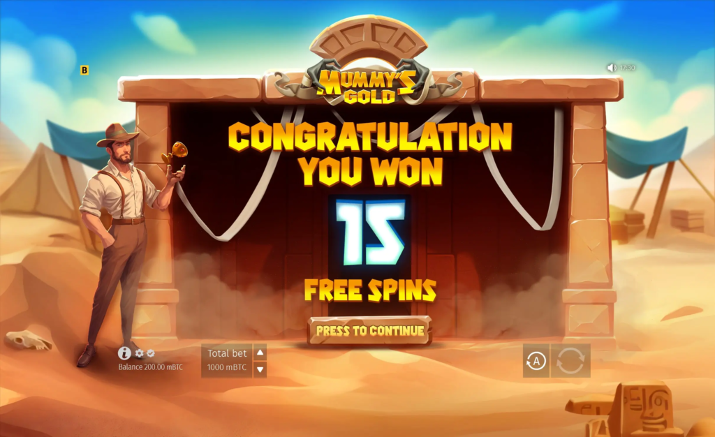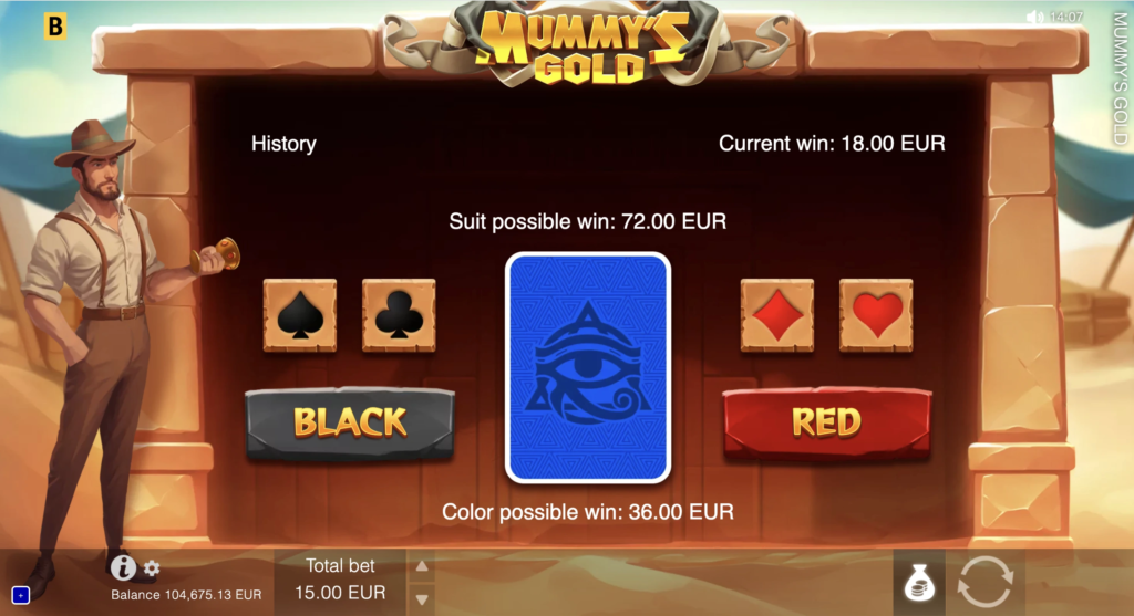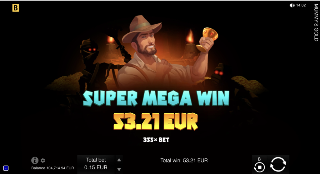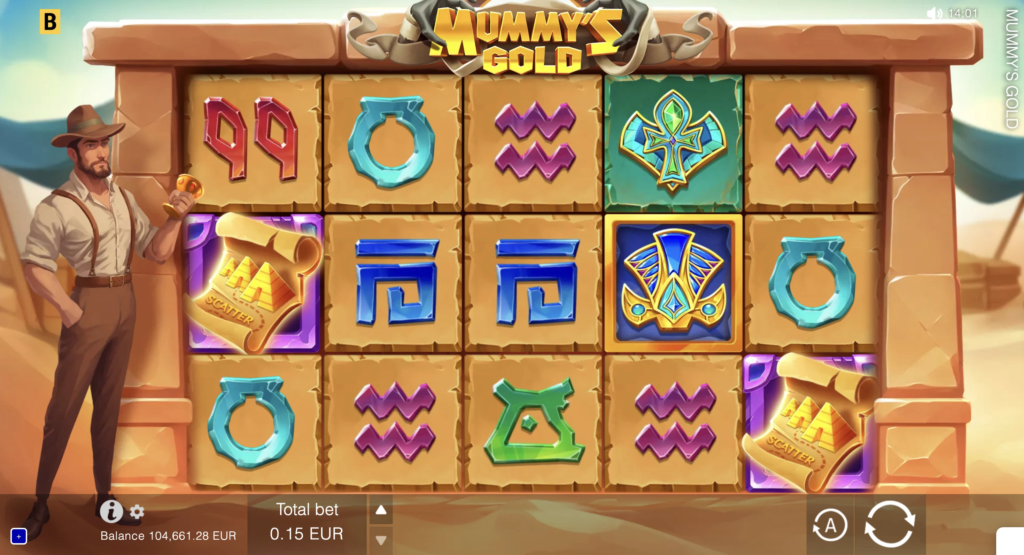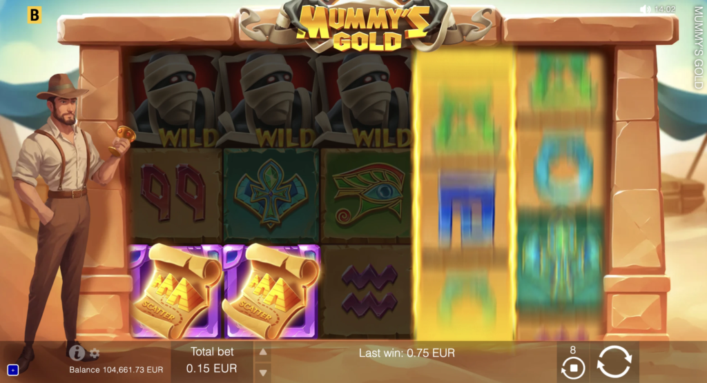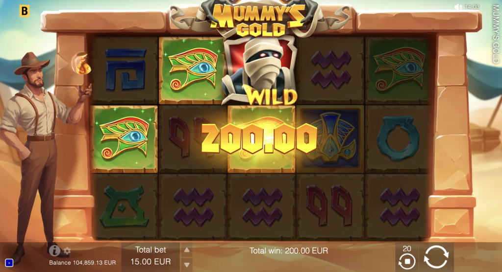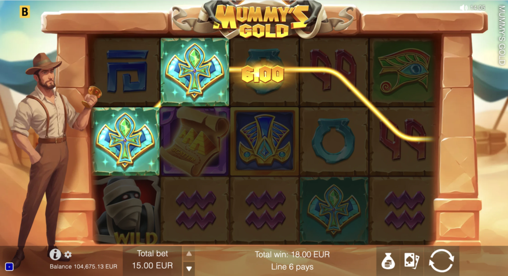 La tragamonedas egipcia de 5×3 presenta símbolos del tesoro y comodines en carretes giratorios. Cada victoria desbloquea una ronda de apuesta o puede dar lugar a tiradas gratis dentro de la tumba de la momia, con la posibilidad de que se vuelvan a activar.