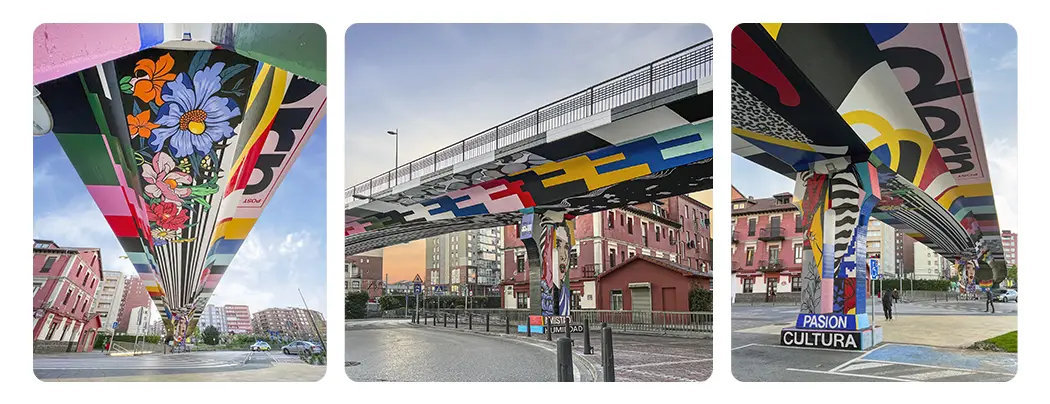 No hace mucho, emprendí la tarea de pintar un importante puente de 300 metros cuadrados situado en la región norte de España. Mi intención era integrar perfectamente mi obra de arte con la arquitectura existente y el paisaje circundante y, al mismo tiempo, transmitir un mensaje potente. El concepto consistía en utilizar las columnas del puente como enlaces para representar figuras femeninas que soportaban el peso del mundo sobre sus cabezas. Esta representación pretendía extenderse hasta el techo del puente. Aunque la idea se concibió rápidamente, se dedicó una cantidad considerable de tiempo a estudiar exhaustivamente la arquitectura y los elementos estructurales del puente para garantizar la realización exitosa de esta intrincada pintura.