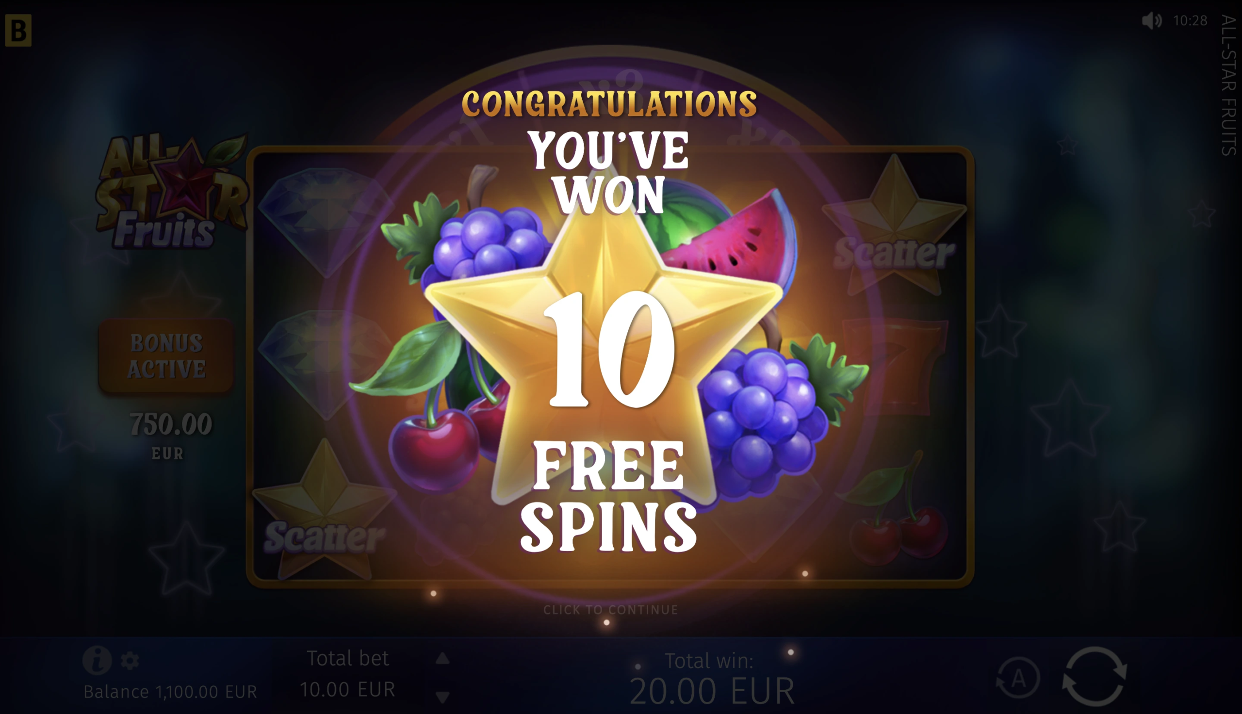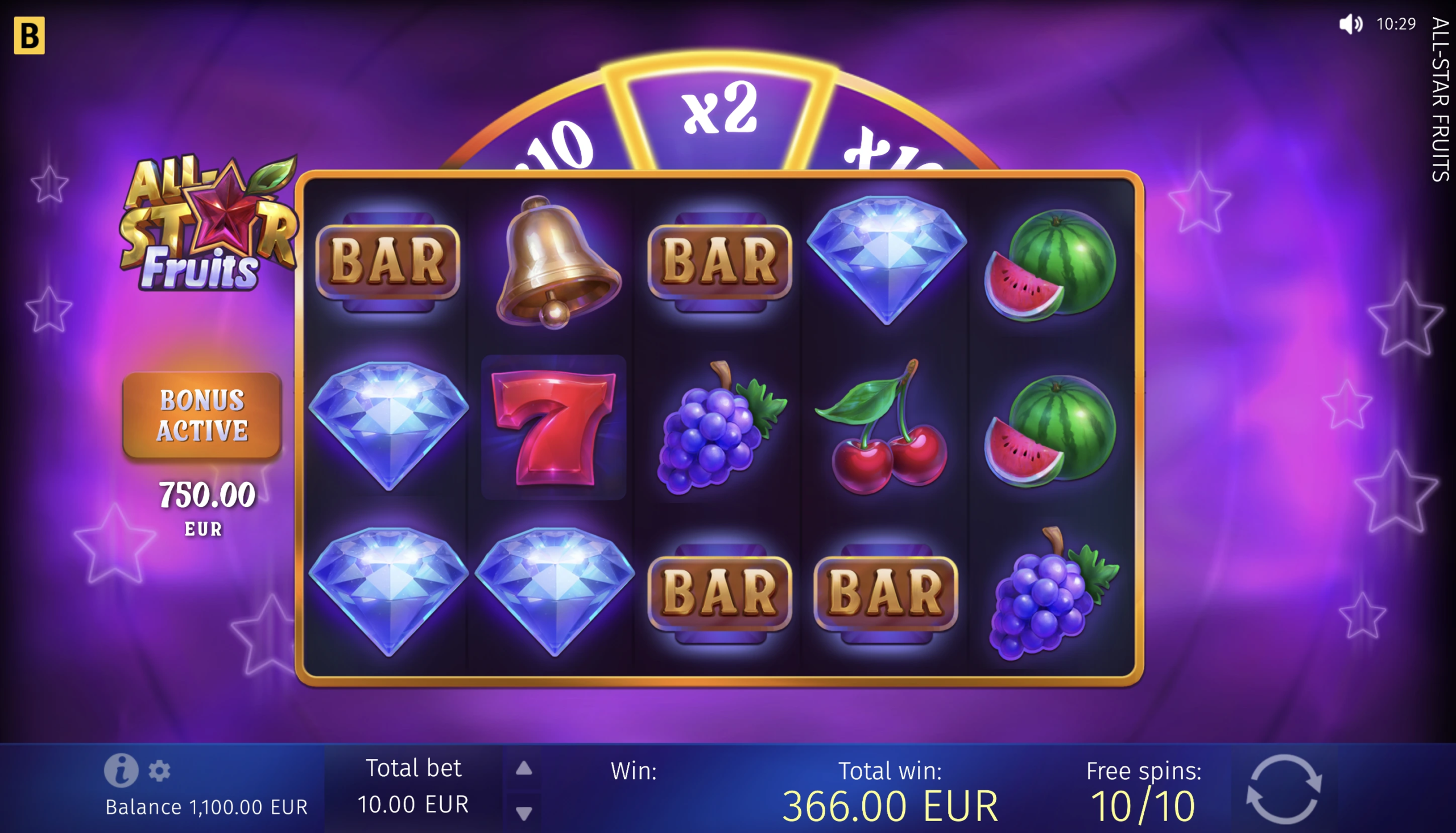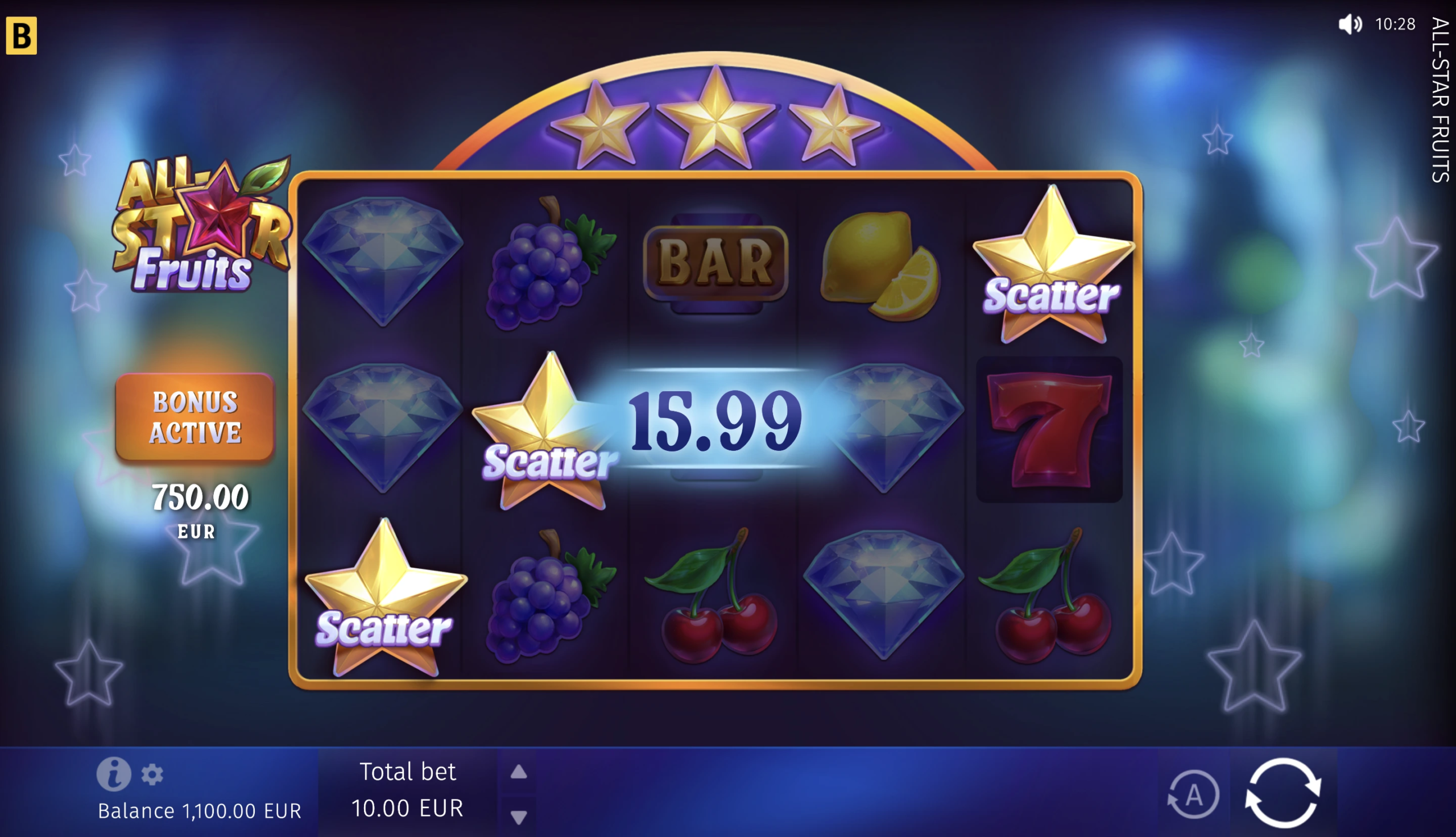 The biggest win in All-Star Fruits can reach up to x1,500 of your stake, resulting in significant winning potential considering the slot’s medium volatility and high RTP.