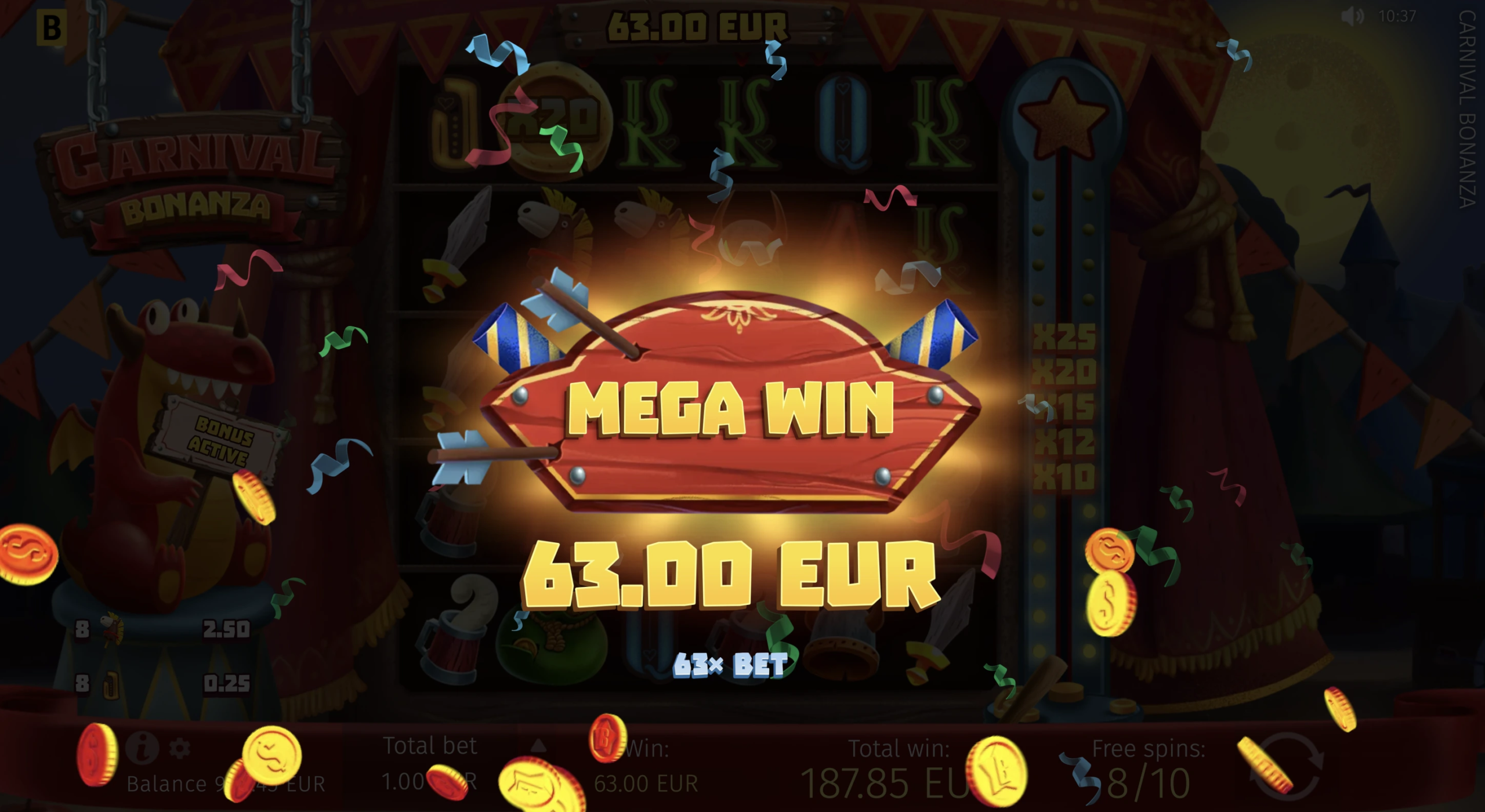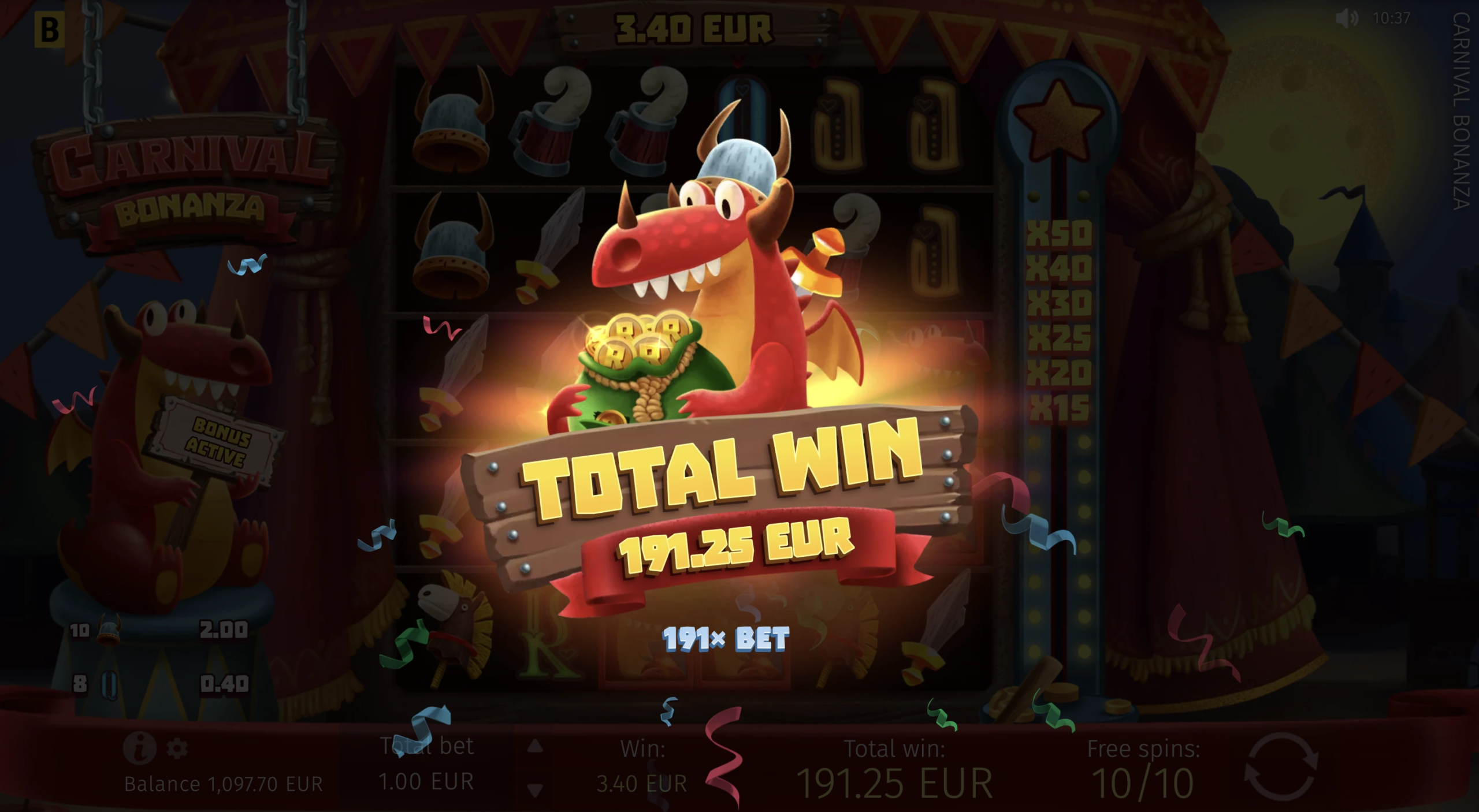 In Carnival Bonanza, players can achieve the rewarding maximum win of up to x14,134 of their stake, offering a chance for significant payouts in this fairy-tale and carnival–themed slot.