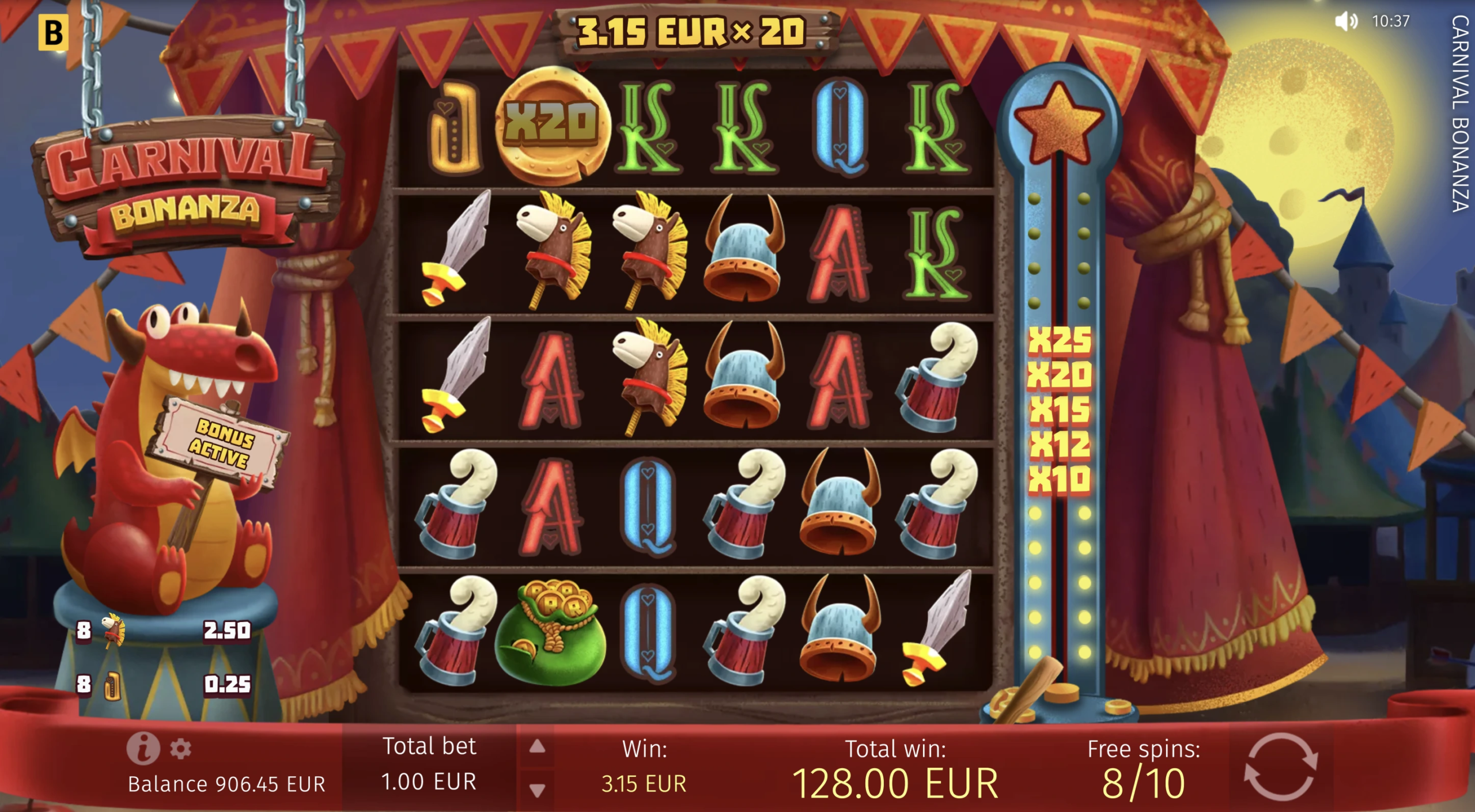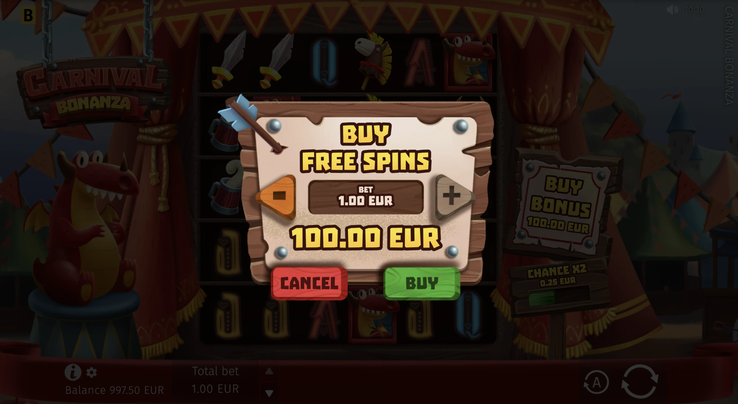 Welcome to Carnival Bonanza, the Medieval fair of your dreams, where symbols pay anywhere! Beyond that, Scatters appear on any reels, and they also set off a round of 10, 20, or 30 Free Spins with x2–x100 multipliers that gradually unlock on the Progress Bar and then randomly appear on the reels. Get Chance x2 or the Buy Bonus to drop Scatters and try the rewarding game sooner!