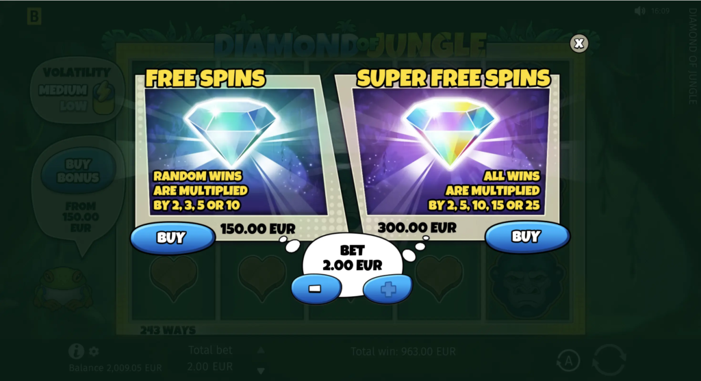 With a comic-book design, this jungle slot supports in-game switching between medium and low volatility, in addition to classic free spins featuring x2 to x10 multipliers for random wins. The Buy Bonus options include a basic bonus round and Super Free Spins, where each win is randomly multiplied by x2 to x25.