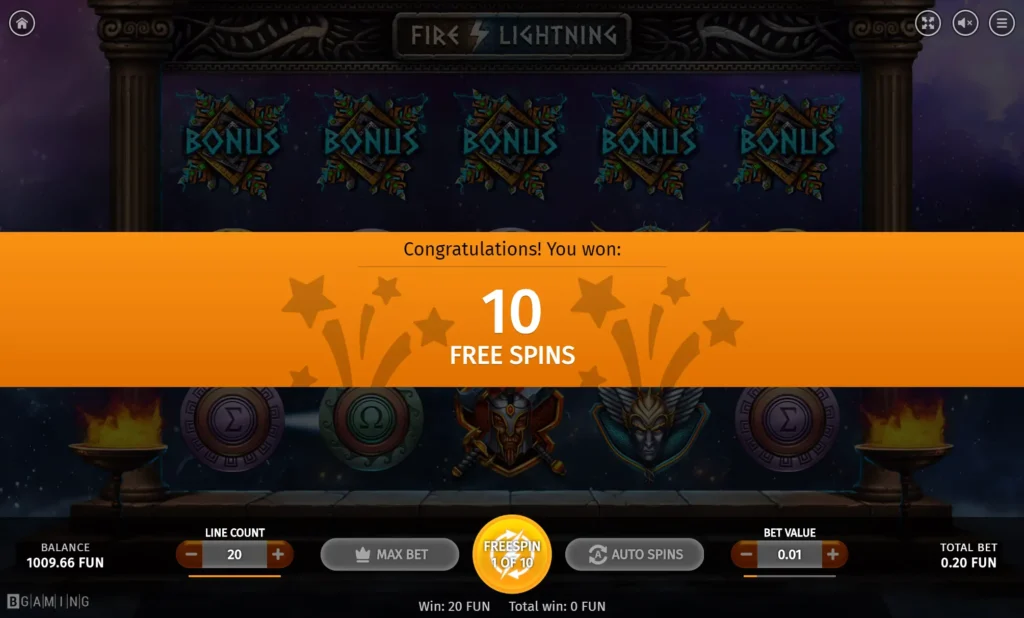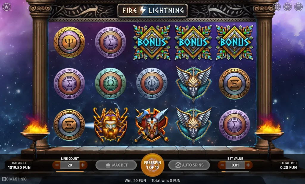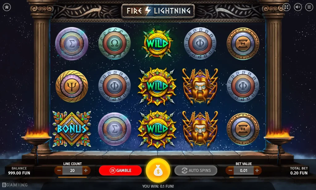 Fire Lightning is a proud achievement resulting from the restructuring and reinforcement of the BGaming team by the talented and fresh-blood developers, mathematicians, and artists. This slot game embodies the new values we uphold in all our products: premium design, meticulous attention to detail, Provably Fair control, and meaningful messages embedded within each game. As you embark on your quest for goodwill and big winnings, prepare to encounter the captivating world of Fire Lightning.