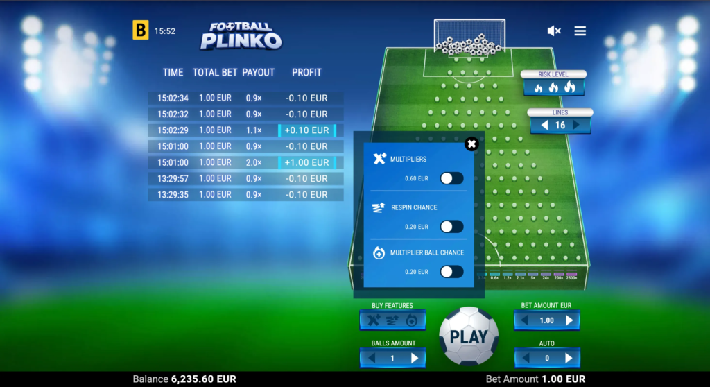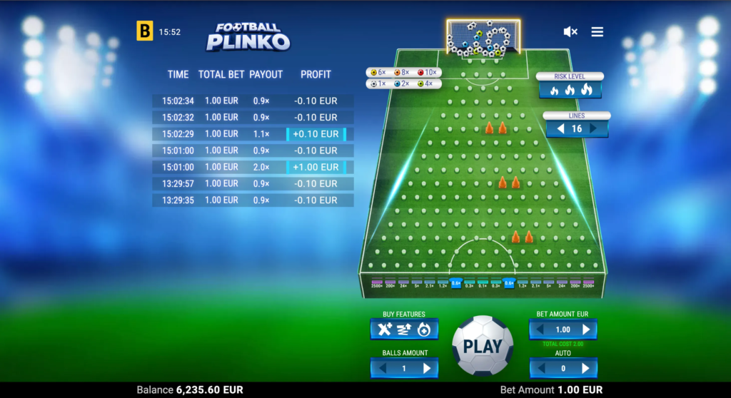 The maximum win in BGaming’s Football Plinko can reach up to x10,000 of the player’s bet. By strategically combining various features, players have the potential to unlock big wins and significantly boost their earnings.