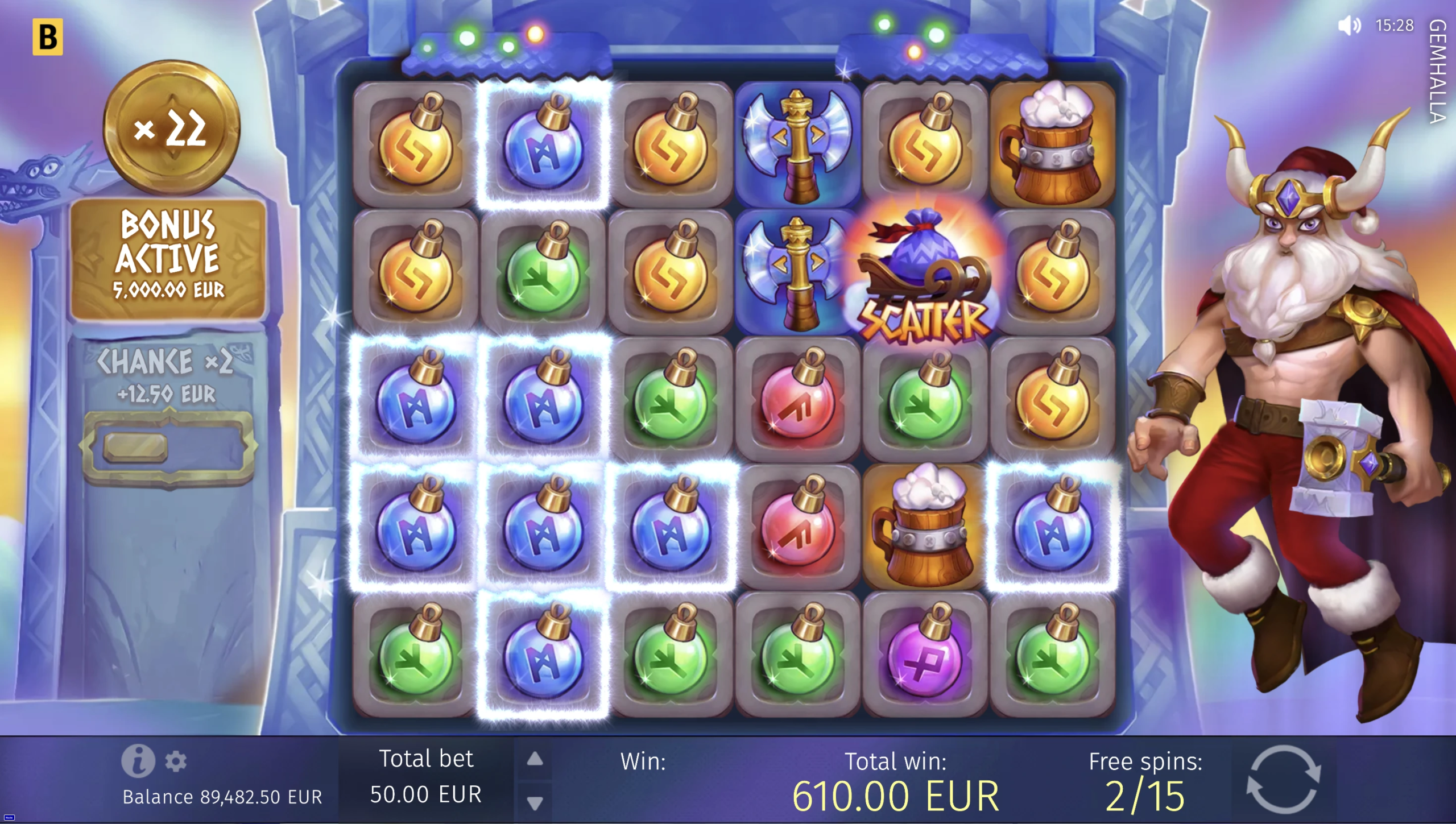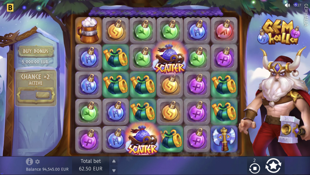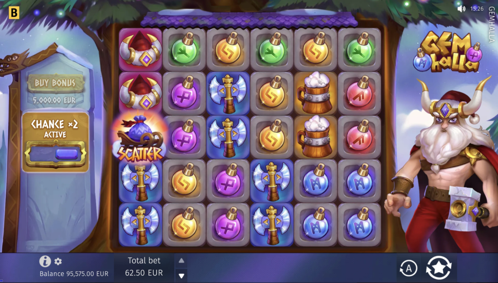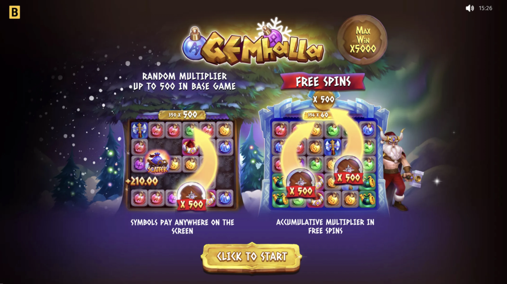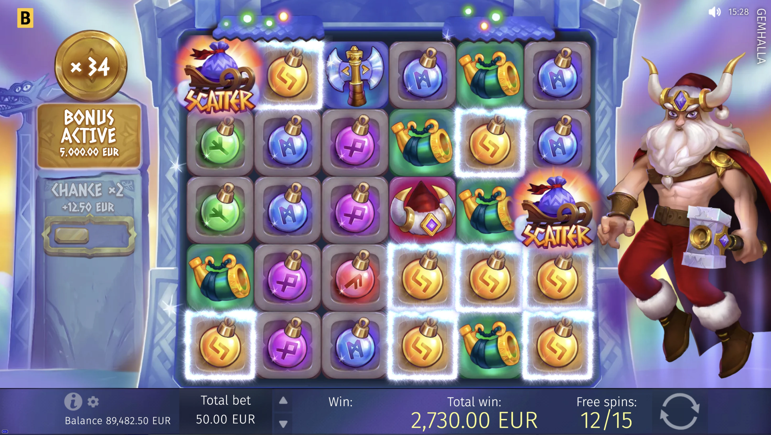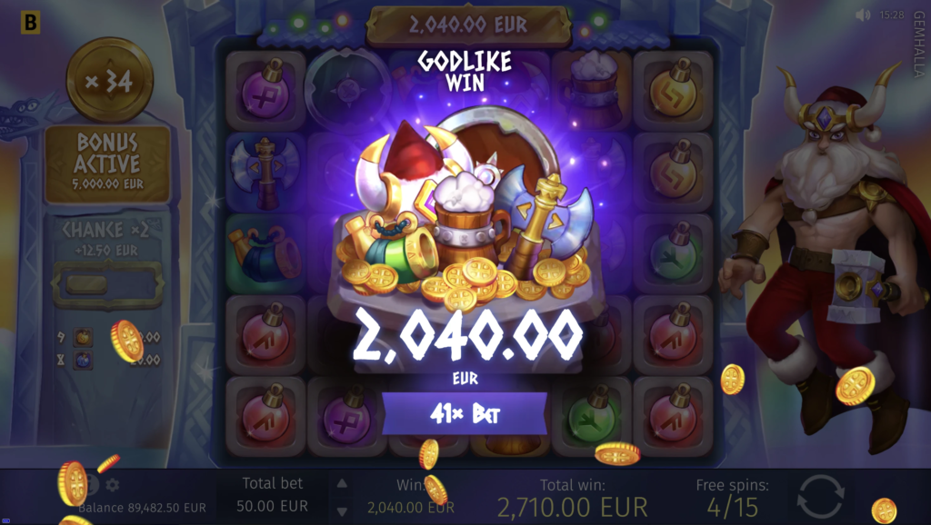 In Norse mythology, the mighty Thor is the god of lightning and thunder, and in Gemhalla, he uses his incredible magical powers as the god of multipliers! Watch him change into a festive red garment and switch his regular horned helmet to a holiday one in the name of the Xmas celebrations, and join the merrymaking!