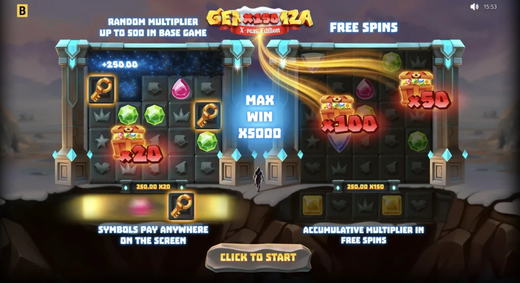 This 5×5 adventure-themed slot combines the Bonanza mechanics with one separate reel for extra winnings. With Gem symbols, the game boasts multipliers, free spins, and available Buy features.