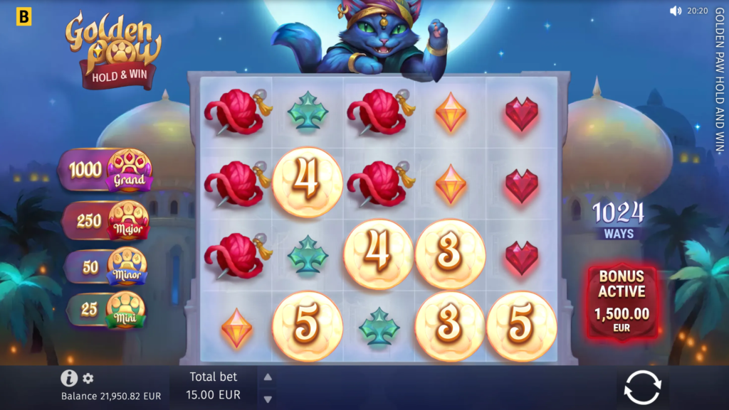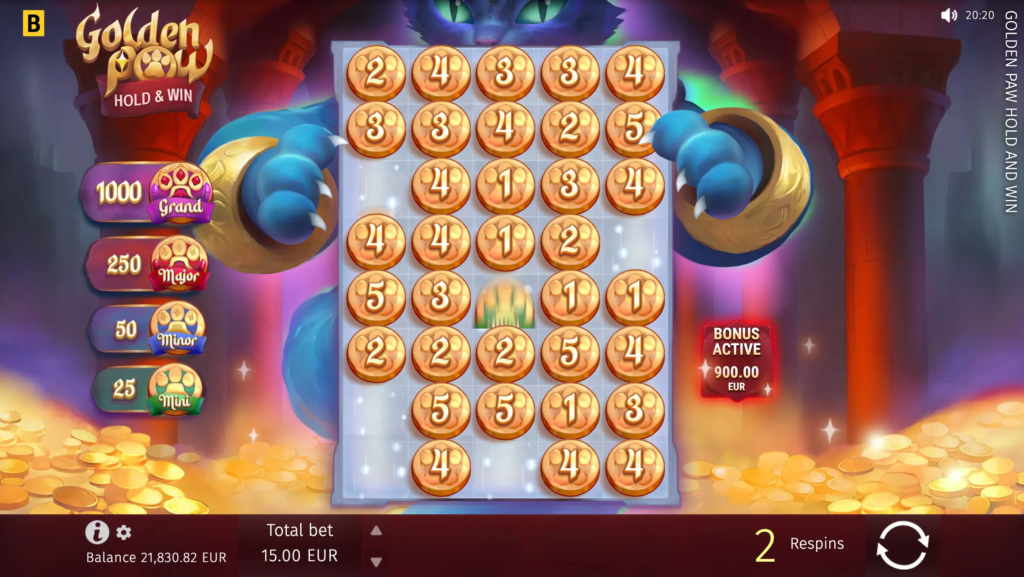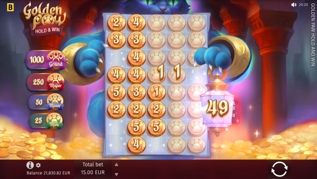 The biggest win in Golden Paw Hold & Win can reach up to x2,000 of a player’s bet. Players have the potential to achieve significant payouts, depending on their bet size.