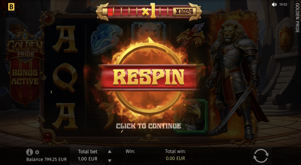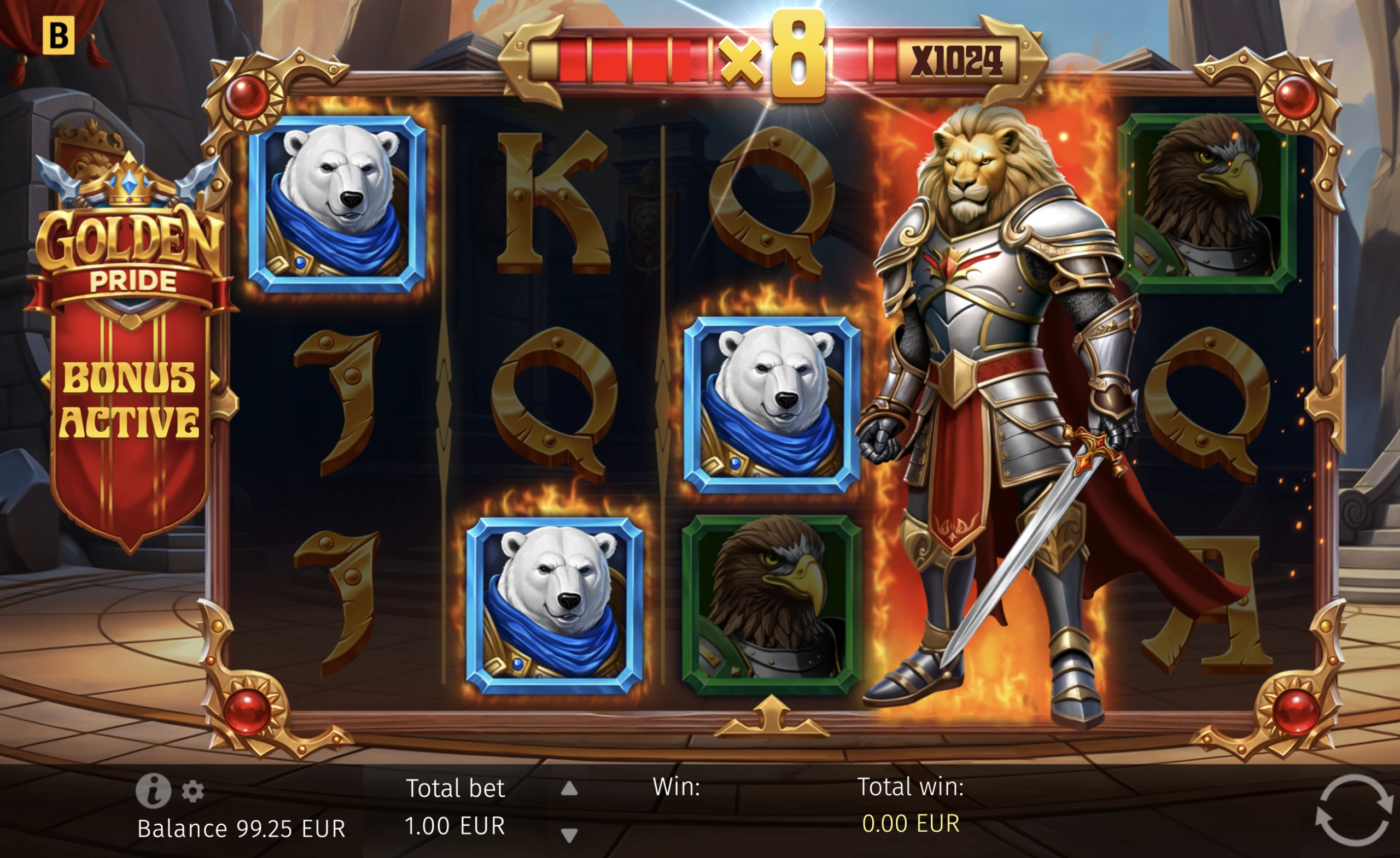 If you accompany the brave King on his relentless quest to defend his Golden Pride, bards will sing tales of your valor for ages! When the Expanded Wild Lion steps onto the field of battle, the Respin action with an ever-progressing multiplier begins, and if fate wills it, a max multiplier of x1,024 can be won in this Bonus challenge. Put on your armor and prove yourself worthy!