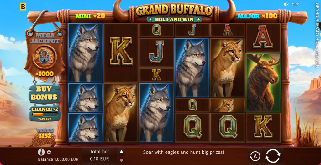 Roam the untamed Wild West in Grand Buffalo Hold and Win, where mighty buffalo rule the plains and colossal jackpots await. This high-volatility BGaming slot features Hold and Win with Lightning expand symbols, Wilds with multipliers, and a progressive system for unlocking the main Jackpot. Giddy up! Take to the West and lasso wins up to ×5,000.