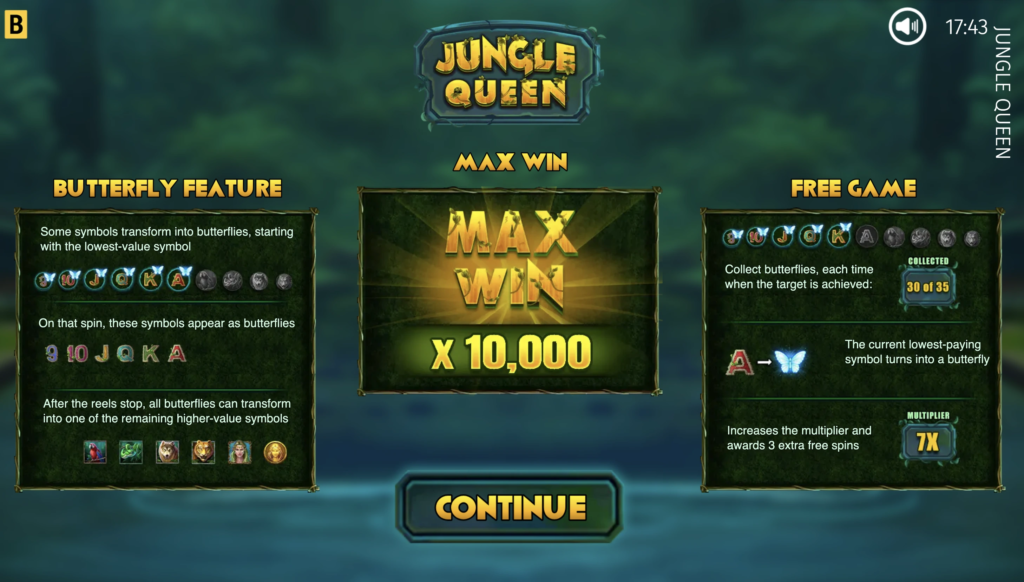 Jungle Queen offers players the chance to win big, with a maximum payout of up to 10,000 times their stake. This provides an exciting opportunity for substantial wins.