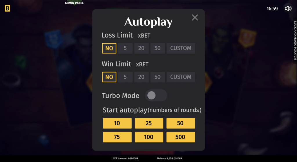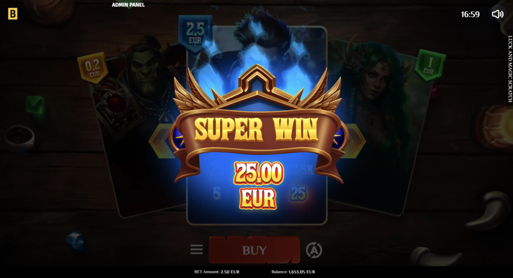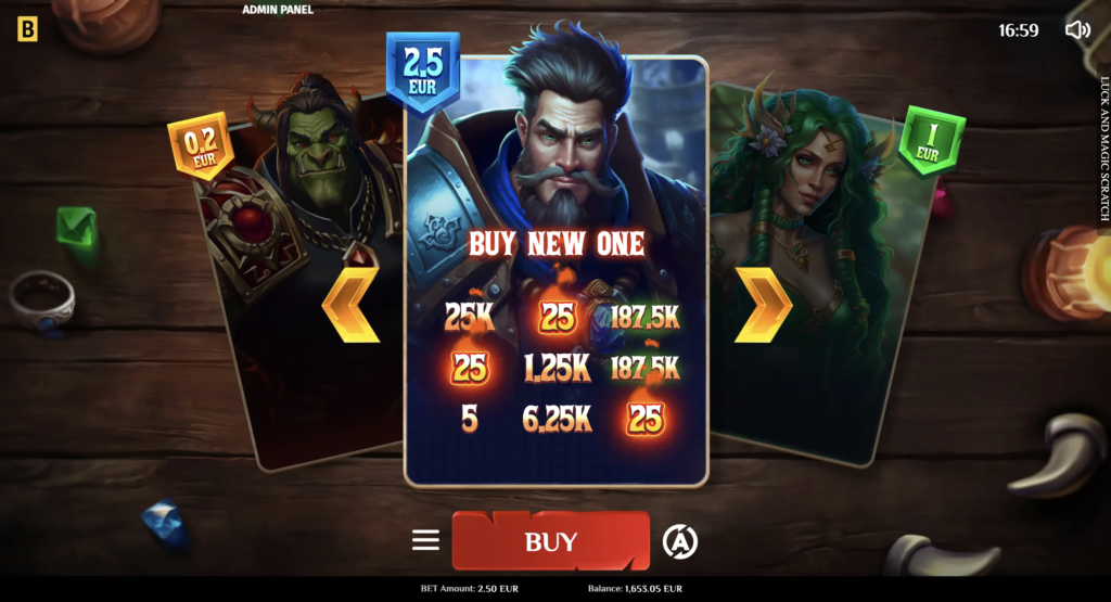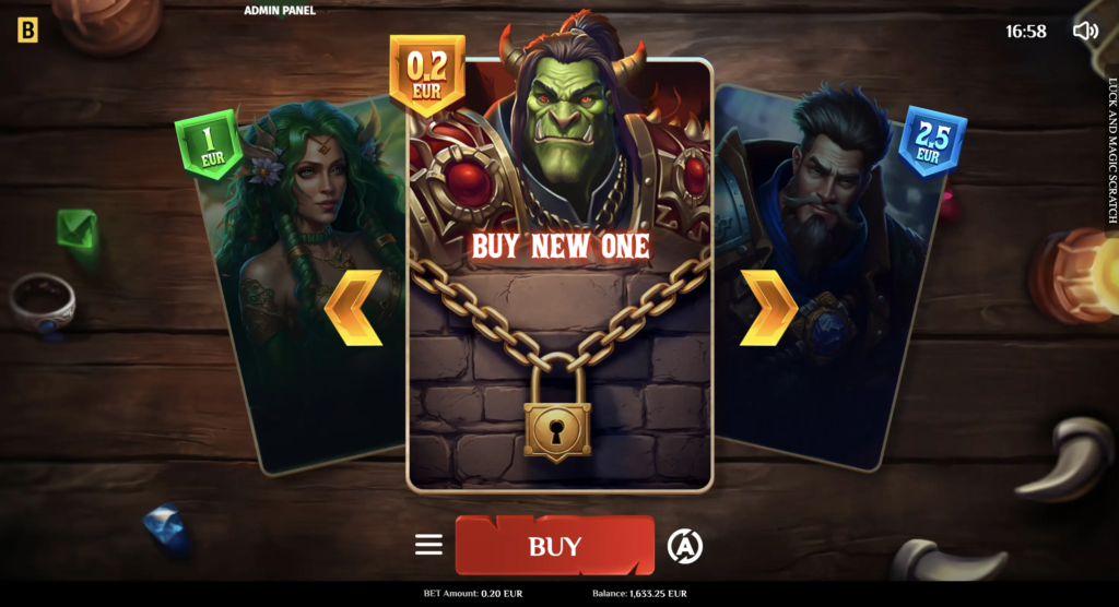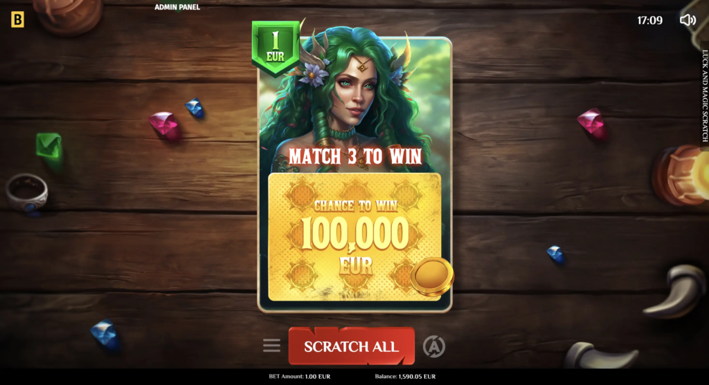 The casual Luck & Magic Scratch offers players a choice of 3 beautiful playing cards, which they can switch in-game. Once players buy a card, they scratch off nine cells to reveal concealed values. If 3 values match, the instant win is applied to the balance.