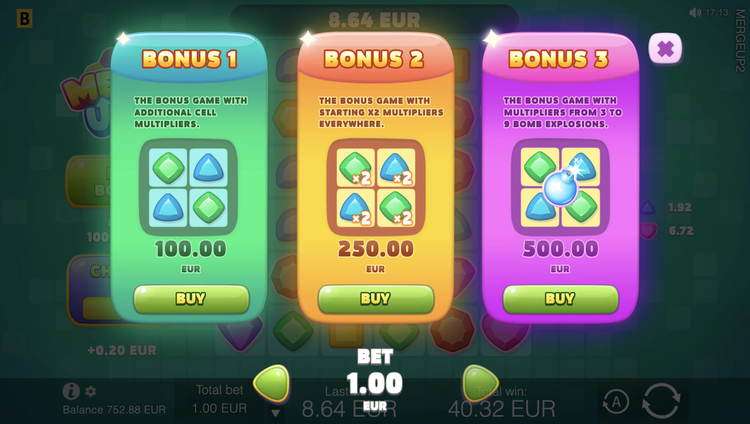 The Merge Up™ 2 slot is the enhanced version of the beloved BGaming hit Merge Up™! It serves improved graphics, offers 3 Buy Bonus options, and integrates multipliers and bombs into the base game, making the gameplay even more dynamic and engaging than in the original title. Spin for high thrills in the bigger and bolder Merge Up™ demo!