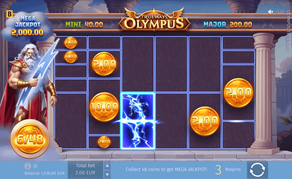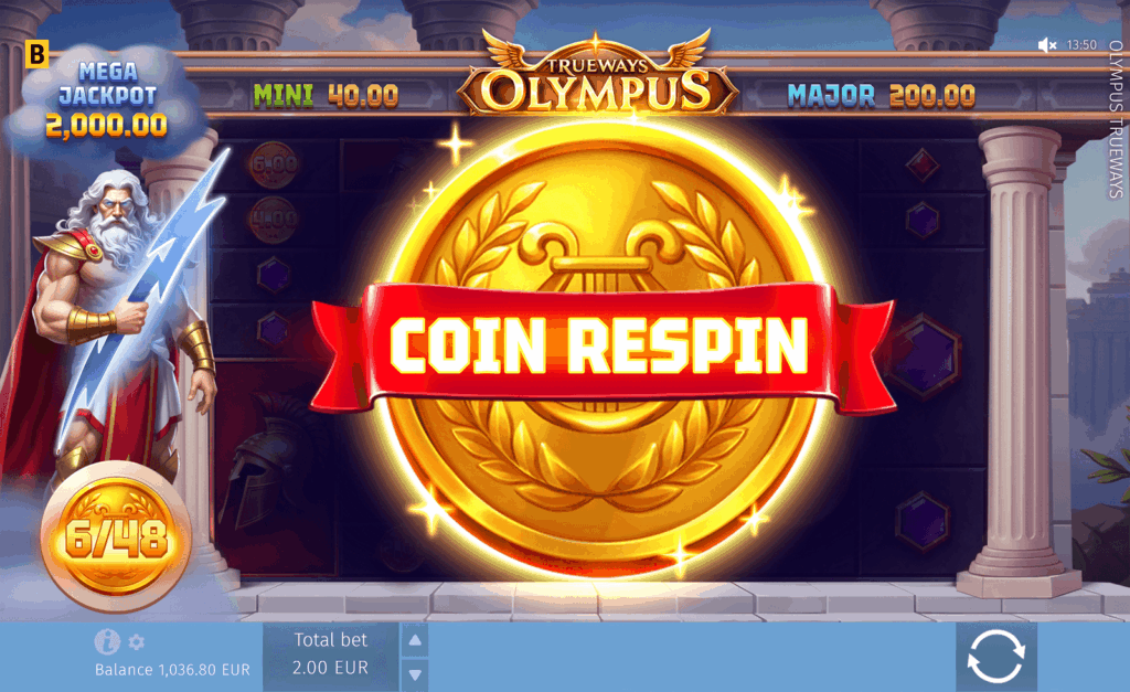 With the lightning bolt Collect symbol in his hand, Zeus watches over Olympus and oversees your attempts at striking it rich. Will you be satisfied with the payouts on the ever-changing main reels, or will only Free Spins with multiplier Wilds and Coin Respin with 3 Jackpots satiate your thirst for big wins?