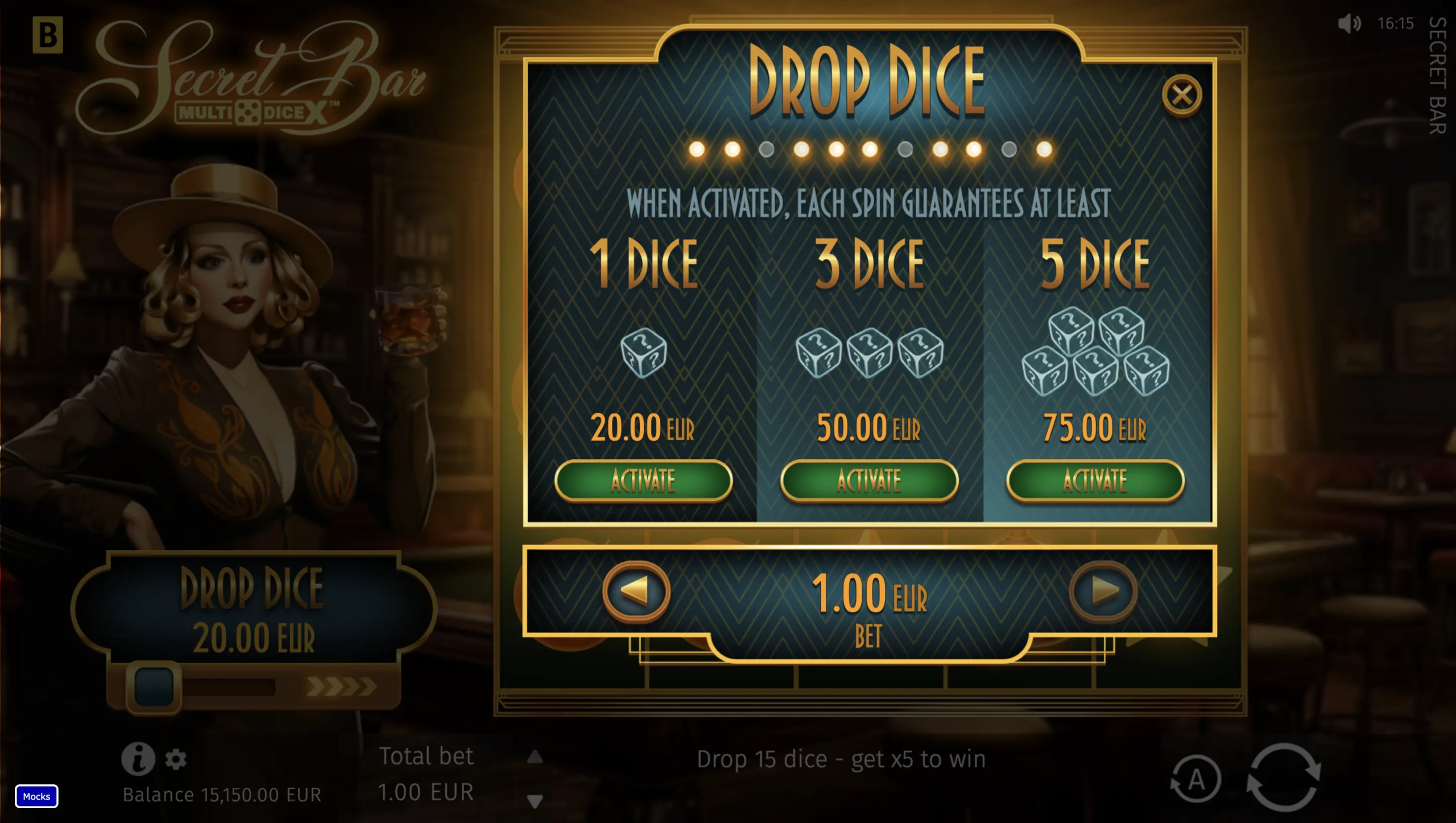Secret Bar MultiDice X offers significant wins thanks to the unique Dice feature, with a maximum payout of up to 2,500 times the bet.