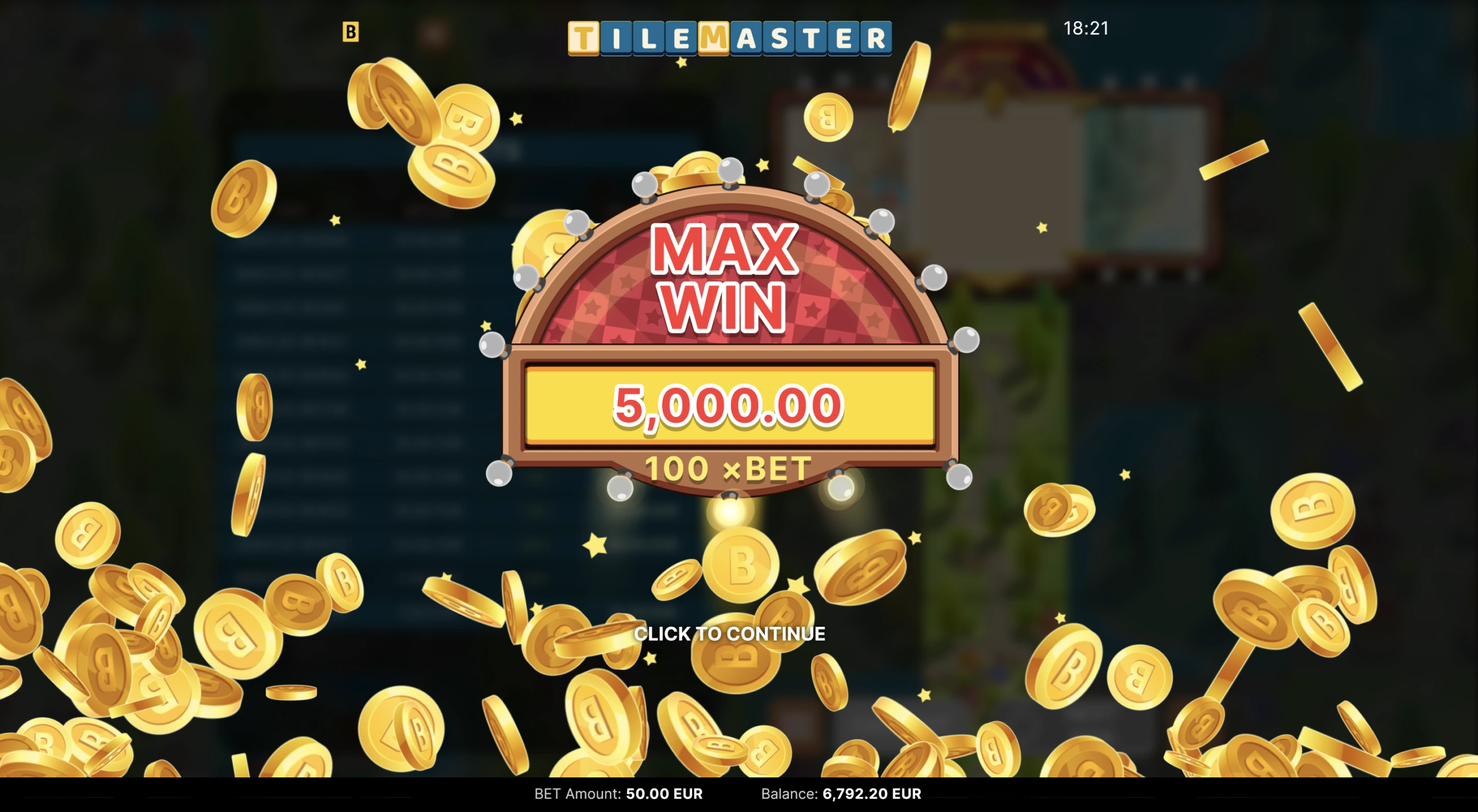 Your win potential in Tile Master depends on your strategy and the chosen volatility. The multiplier increases with each successfully connected tile, offering significant rewards if you cash out before the tile succession is broken. The default max win in the game is €250,000.