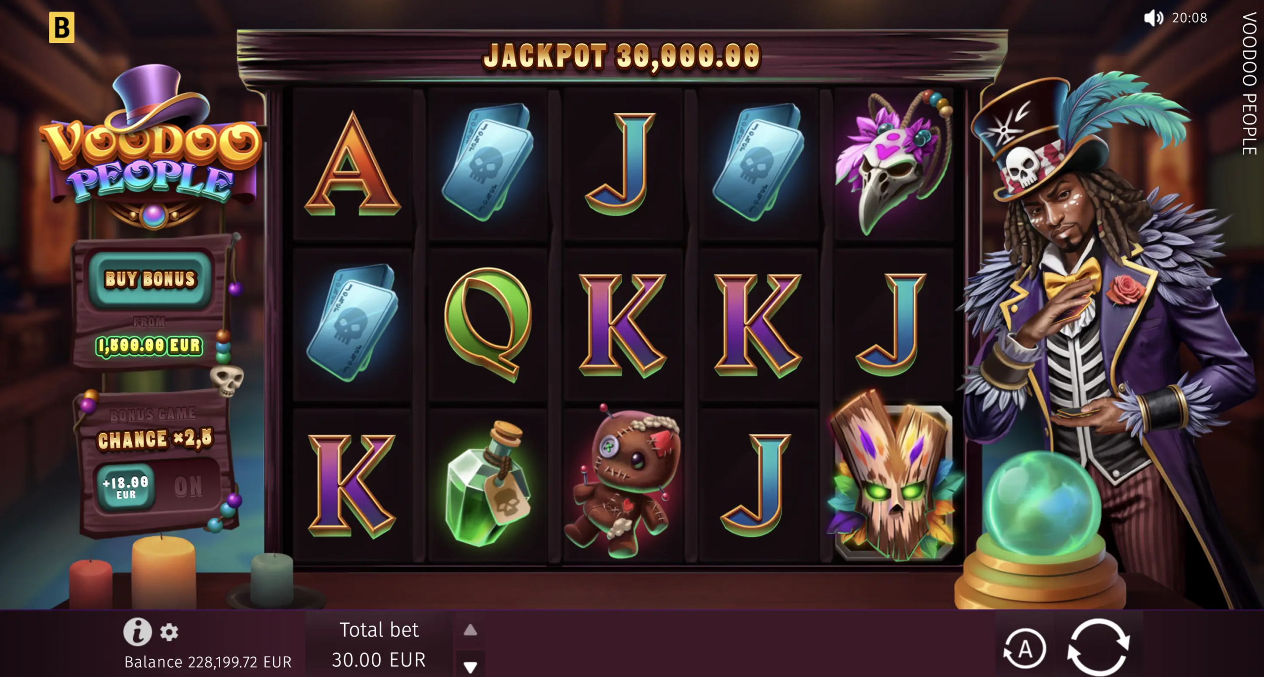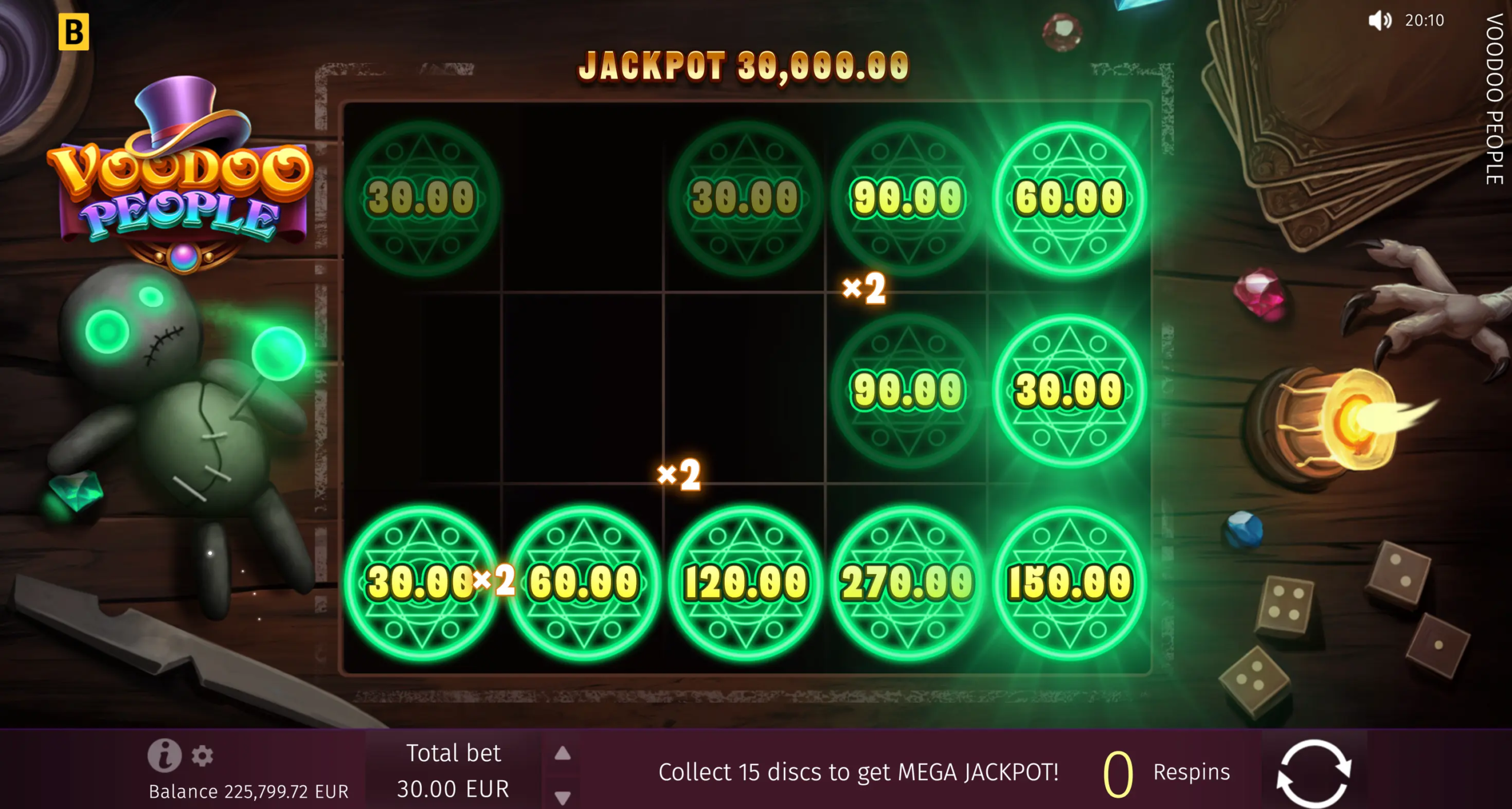 Immerse yourself in a Halloween-esque slot with a Mega Jackpot Hold & Win game that features sticky Voodoo symbols! The more Voodoos you conjure up, the bigger your win will be, not to mention that lines filled with Voodoos assume multipliers at the end of the round. 8 Free Spins with only high symbols in stock are also on offer, and you can even light enchanted candles to enjoy 2.5 times more magic!