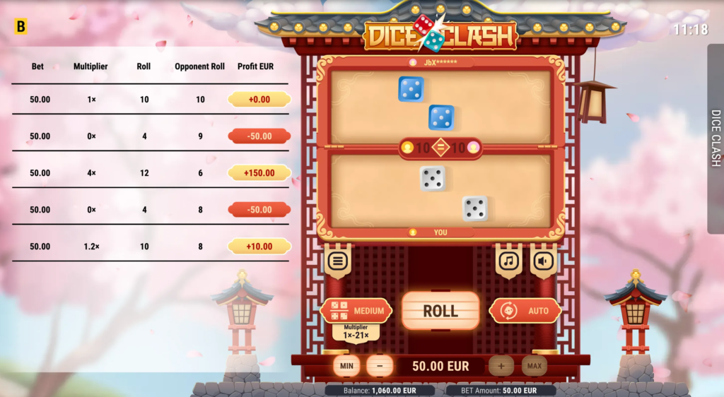 Neste encantador jogo de mesa, os jogadores jogam seus dados contra adversários, tudo em uma paisagem tranquila de Sakura. Escolha seu nível de volatilidade — baixo, médio ou alto — e avance até a vitória! Você vai superá-los e reivindicar sua vitória? Deixe a brisa suave guiar seus dados enquanto você busca a maior recompensa!
