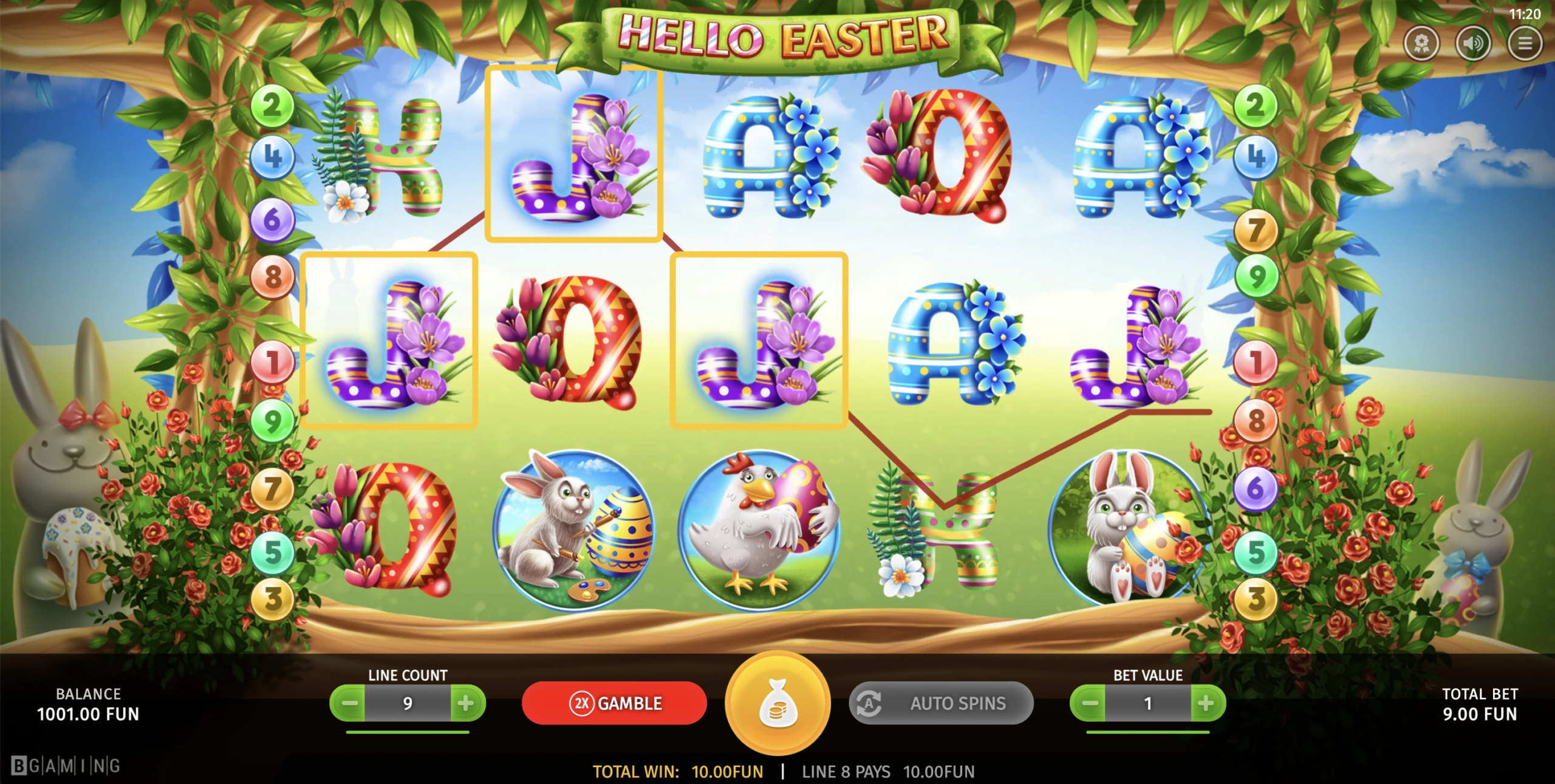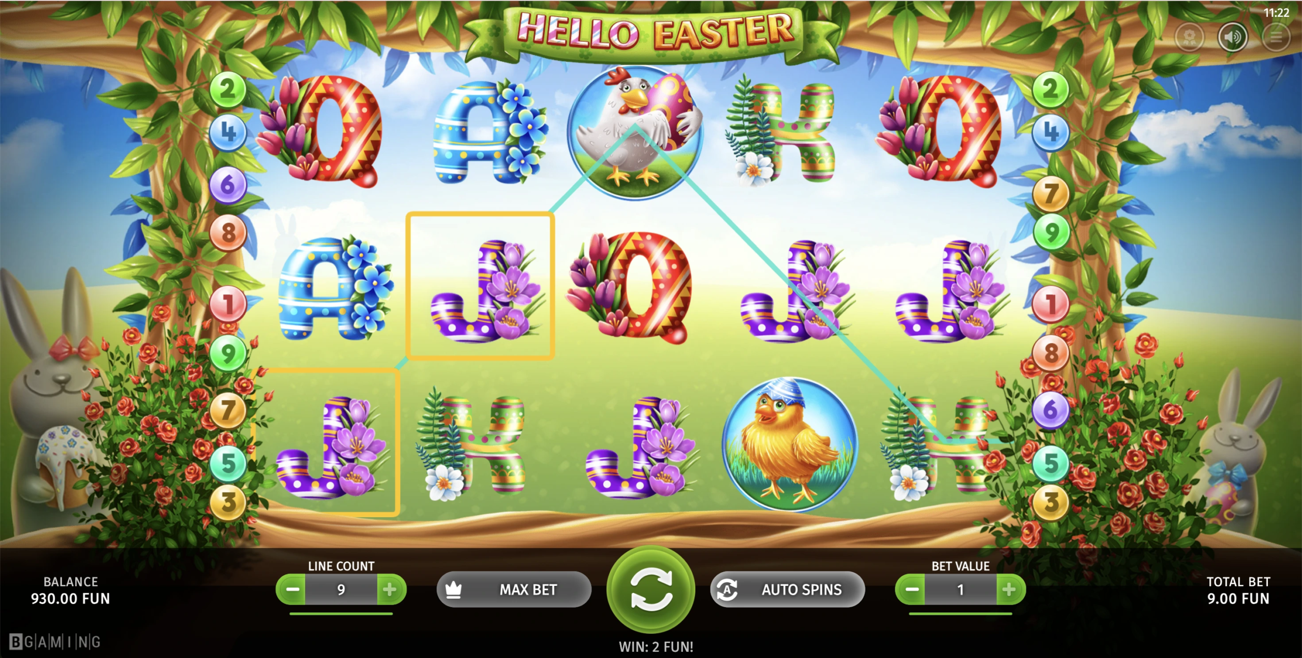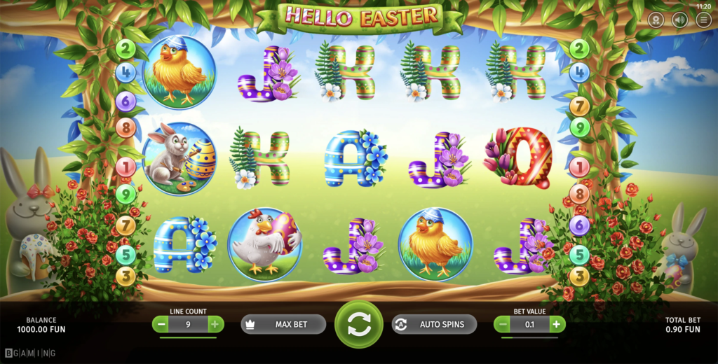 Hello Easter oferece aos jogadores a chance de ganhar até 9.000 vezes sua aposta. Este jogo é perfeito para quem busca uma experiência de caça-níqueis alegre com um potencial de vitória decente e gráficos divertidos com o tema da Páscoa.