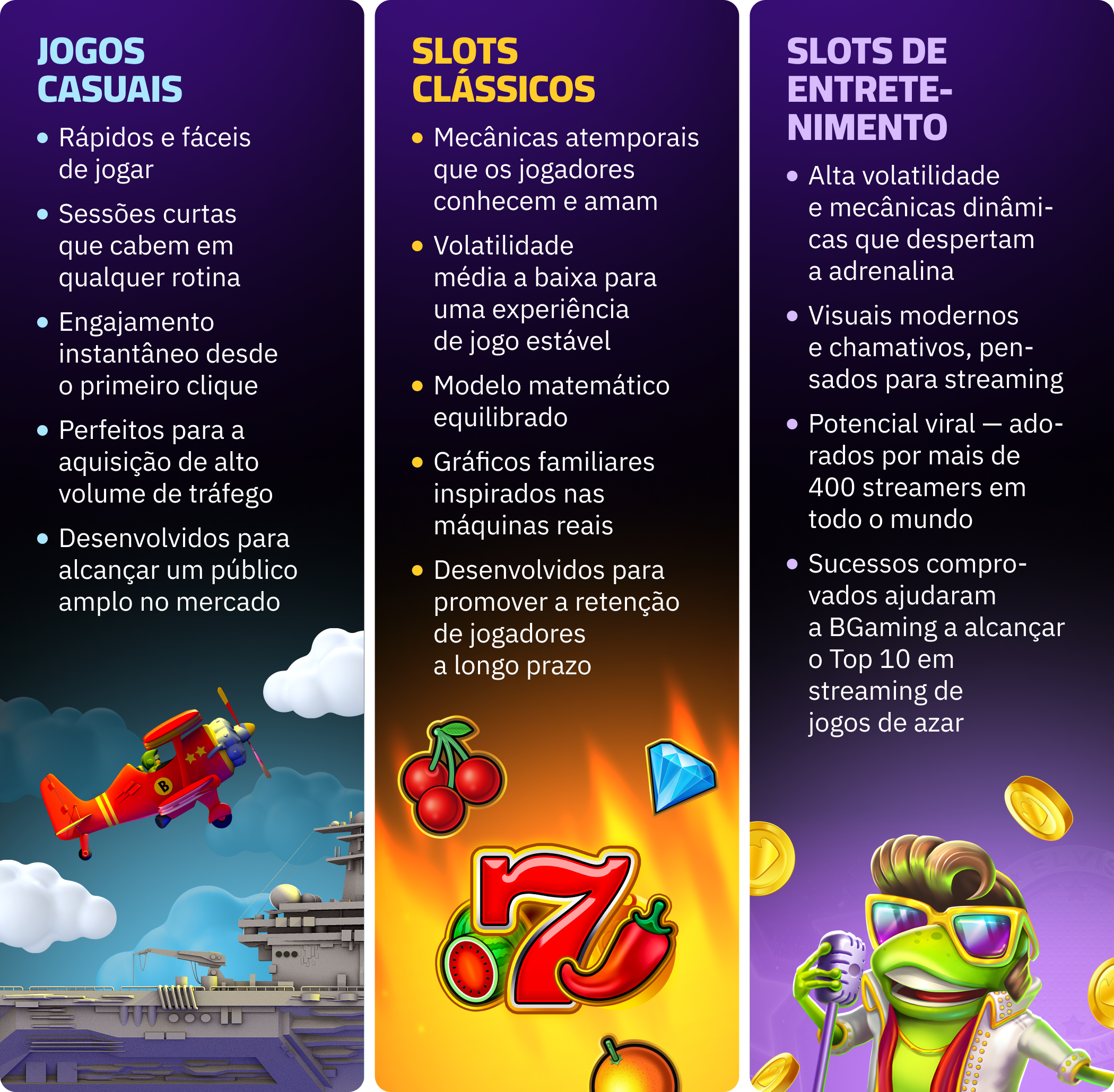 Experimente como é fácil lançar os principais títulos da BGaming, confiáveis pelos principais streamers e construídos para uma conexão duradoura com o jogador.